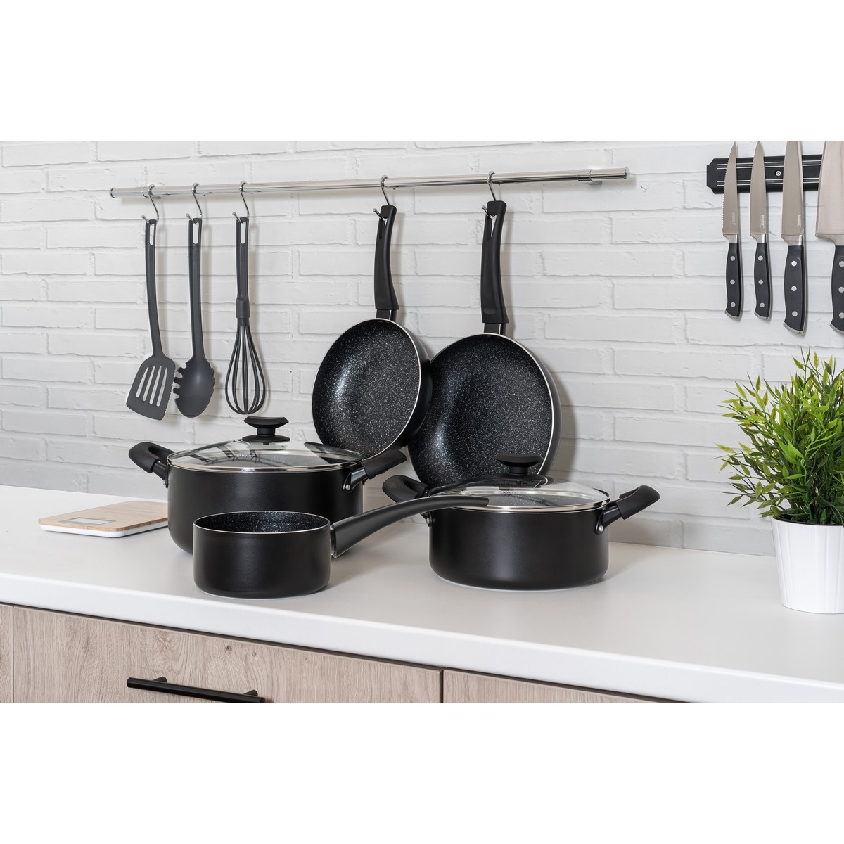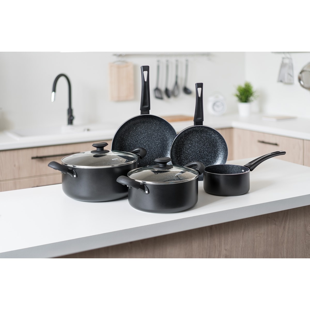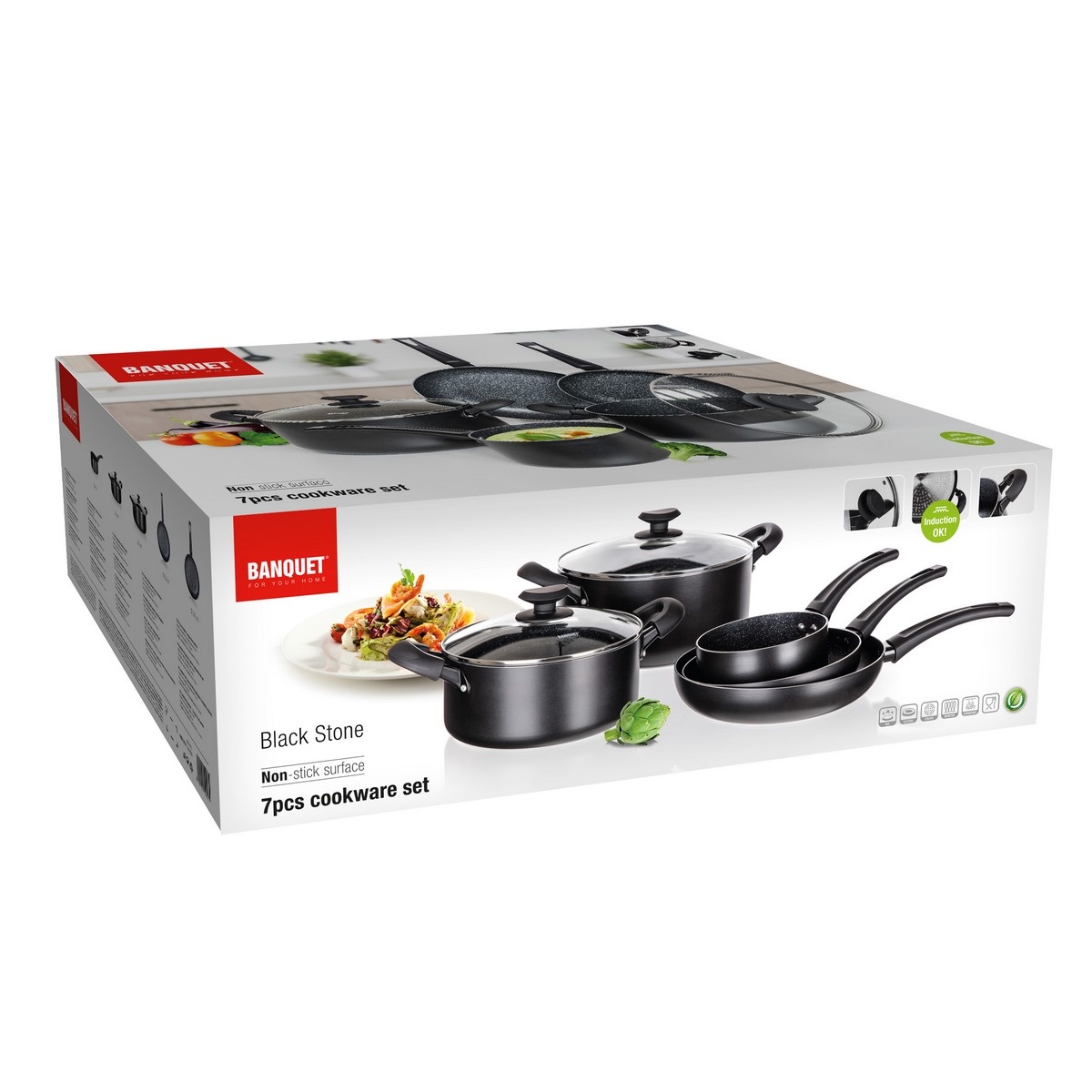 Sadu hliníkového liateho riadu Black Stone využijete pri každodennom varení. Všetko má plne indukčné dno, bakelitové rukoväte so soft touch povrchovou úpravou. Nepriľnavý povrch je veľmi tvrdý a odolný voči poškriabaniu. Výrobky v sade sú odolné voči nárazu a deformácii tvaru. Vysoká tepelná vodivosť zaisťuje rýchle a ekonomické varenie – dlho drží teplotu. Riad je možné použiť na všetky typy varných dosiek. Riad je možné umývať v umývačke.Súprava obsahuje: