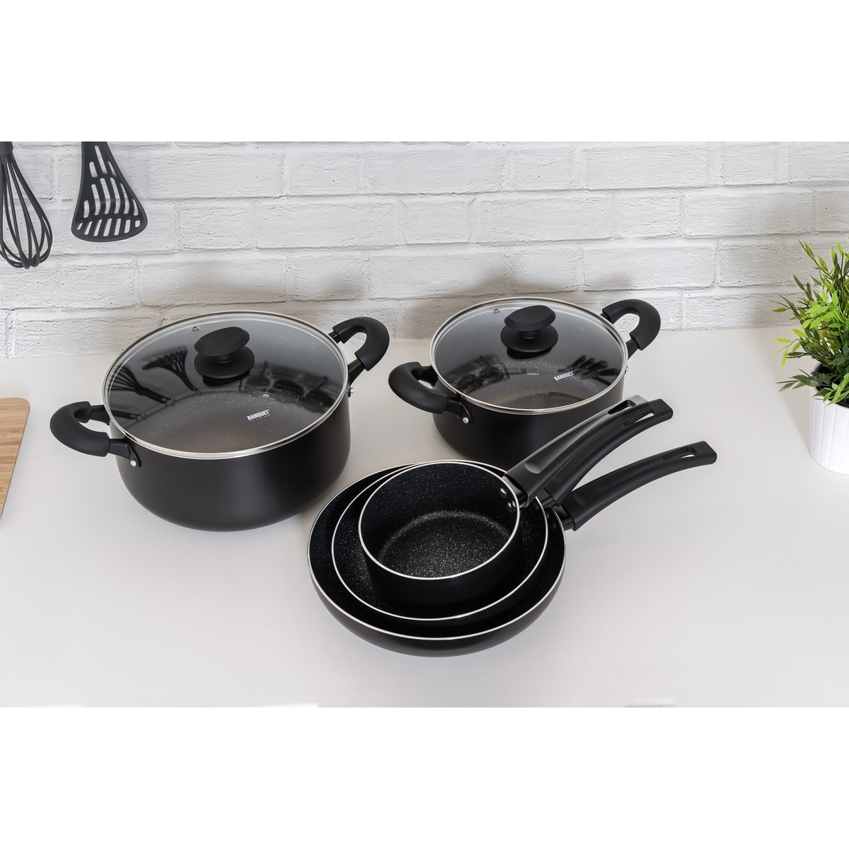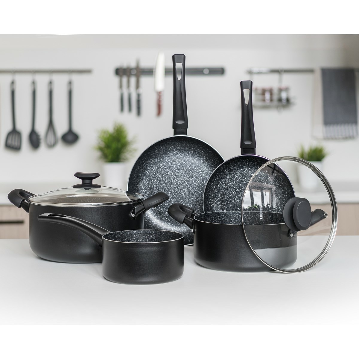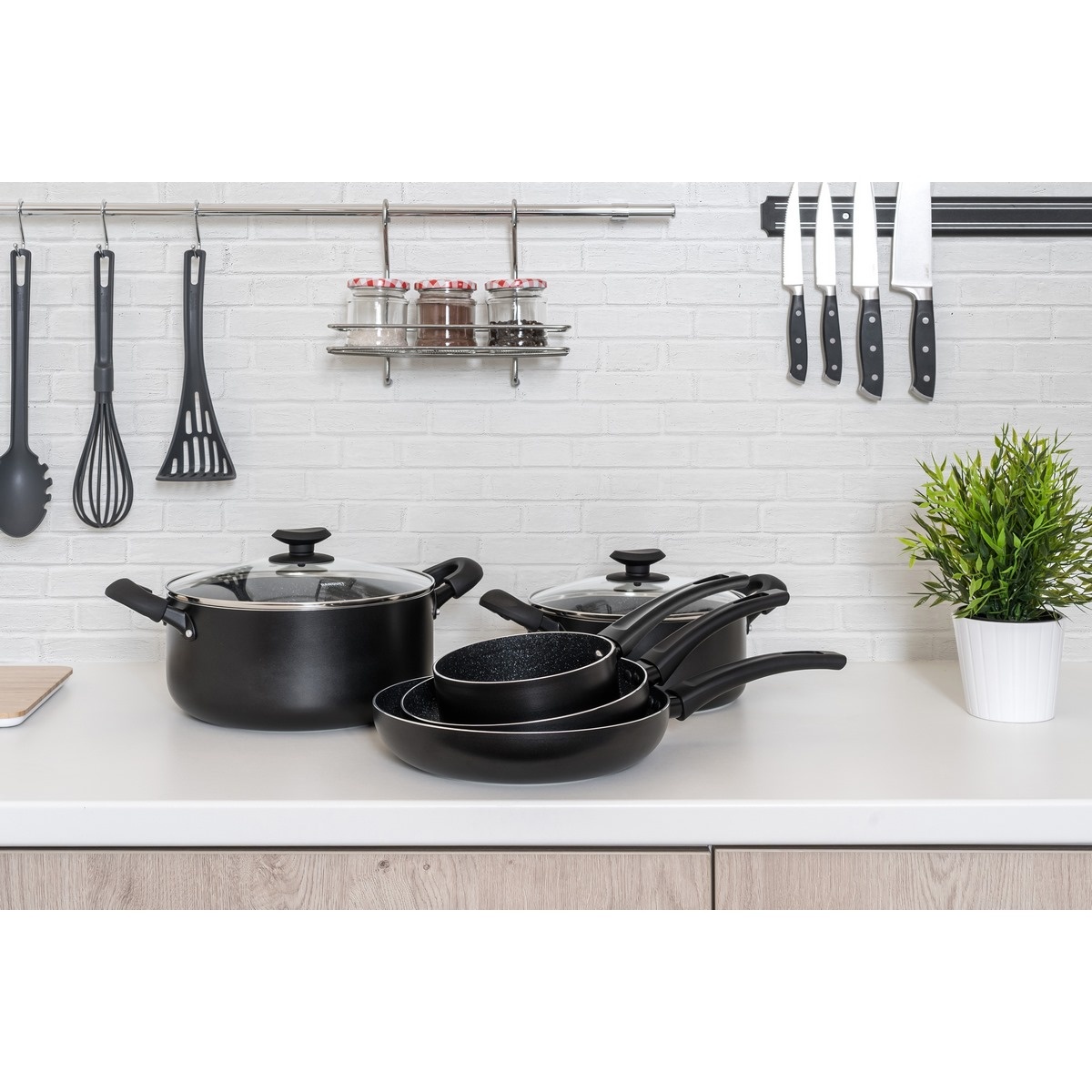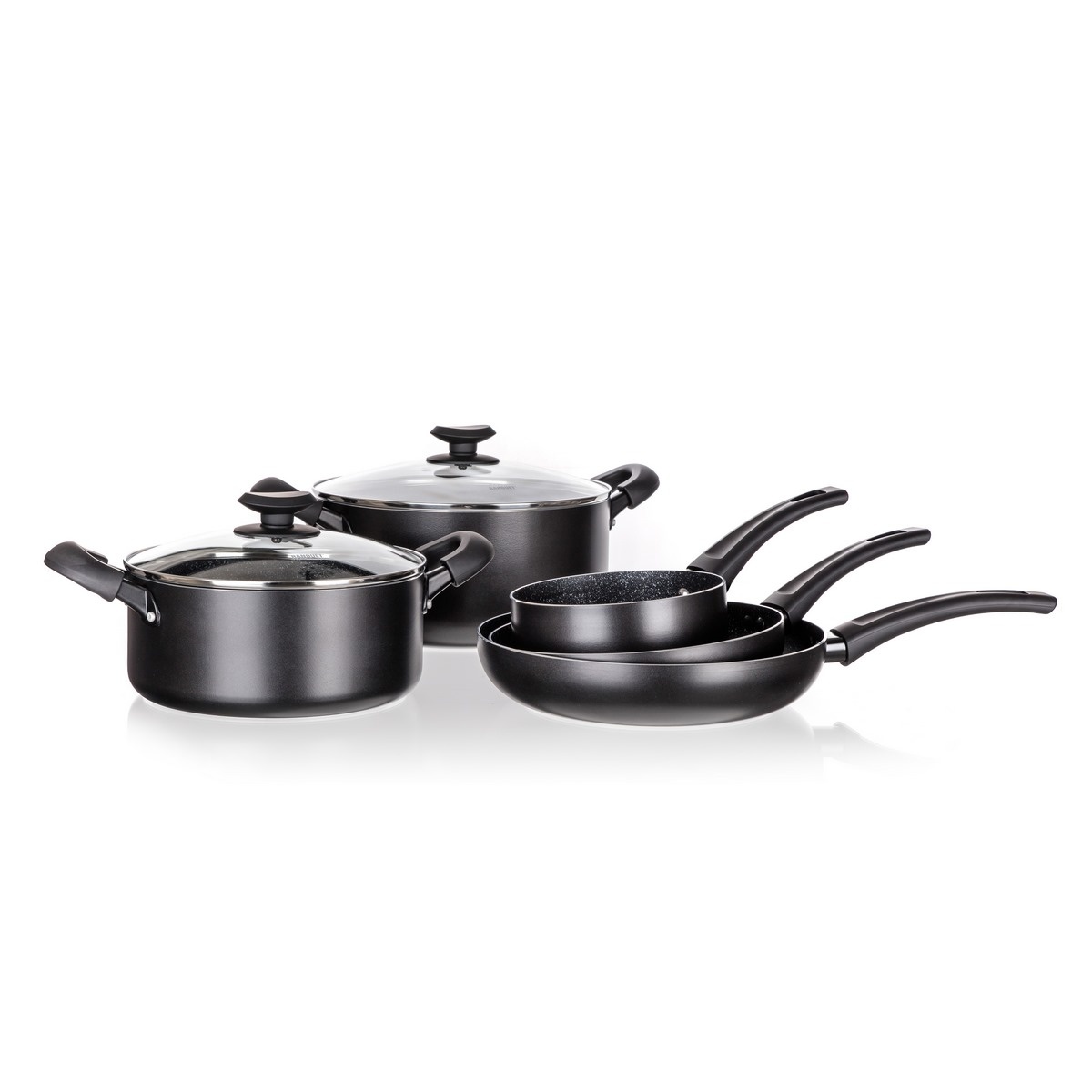 Sadu hliníkového liateho riadu Black Stone využijete pri každodennom varení. Všetko má plne indukčné dno, bakelitové rukoväte so soft touch povrchovou úpravou. Nepriľnavý povrch je veľmi tvrdý a odolný voči poškriabaniu. Výrobky v sade sú odolné voči nárazu a deformácii tvaru. Vysoká tepelná vodivosť zaisťuje rýchle a ekonomické varenie – dlho drží teplotu. Riad je možné použiť na všetky typy varných dosiek. Riad je možné umývať v umývačke.Súprava obsahuje: