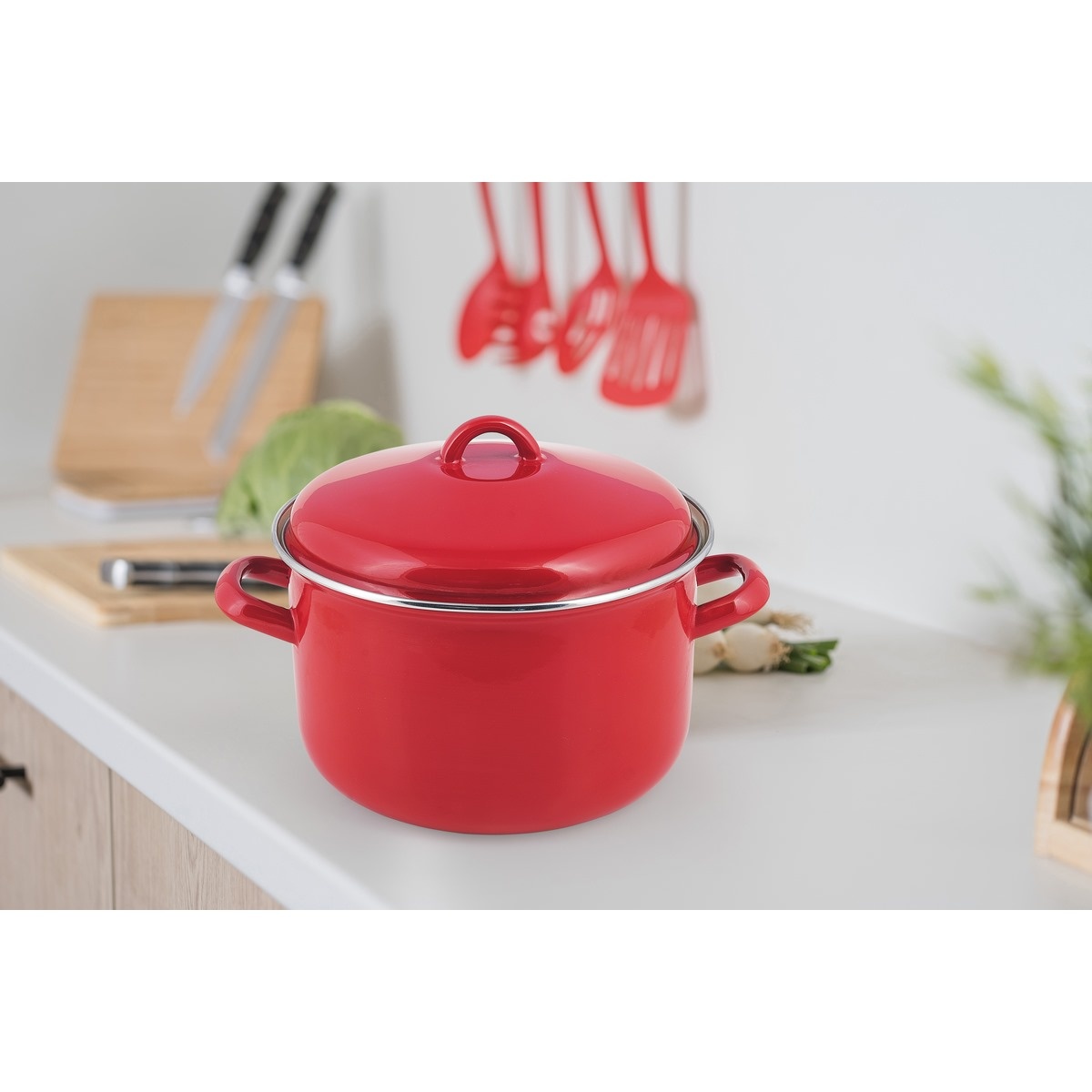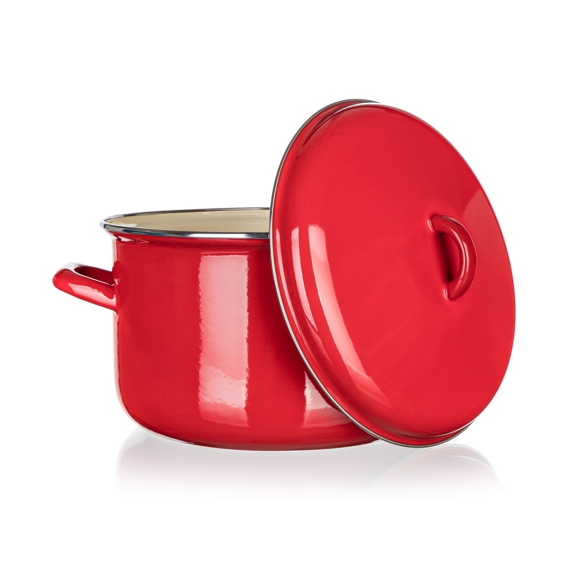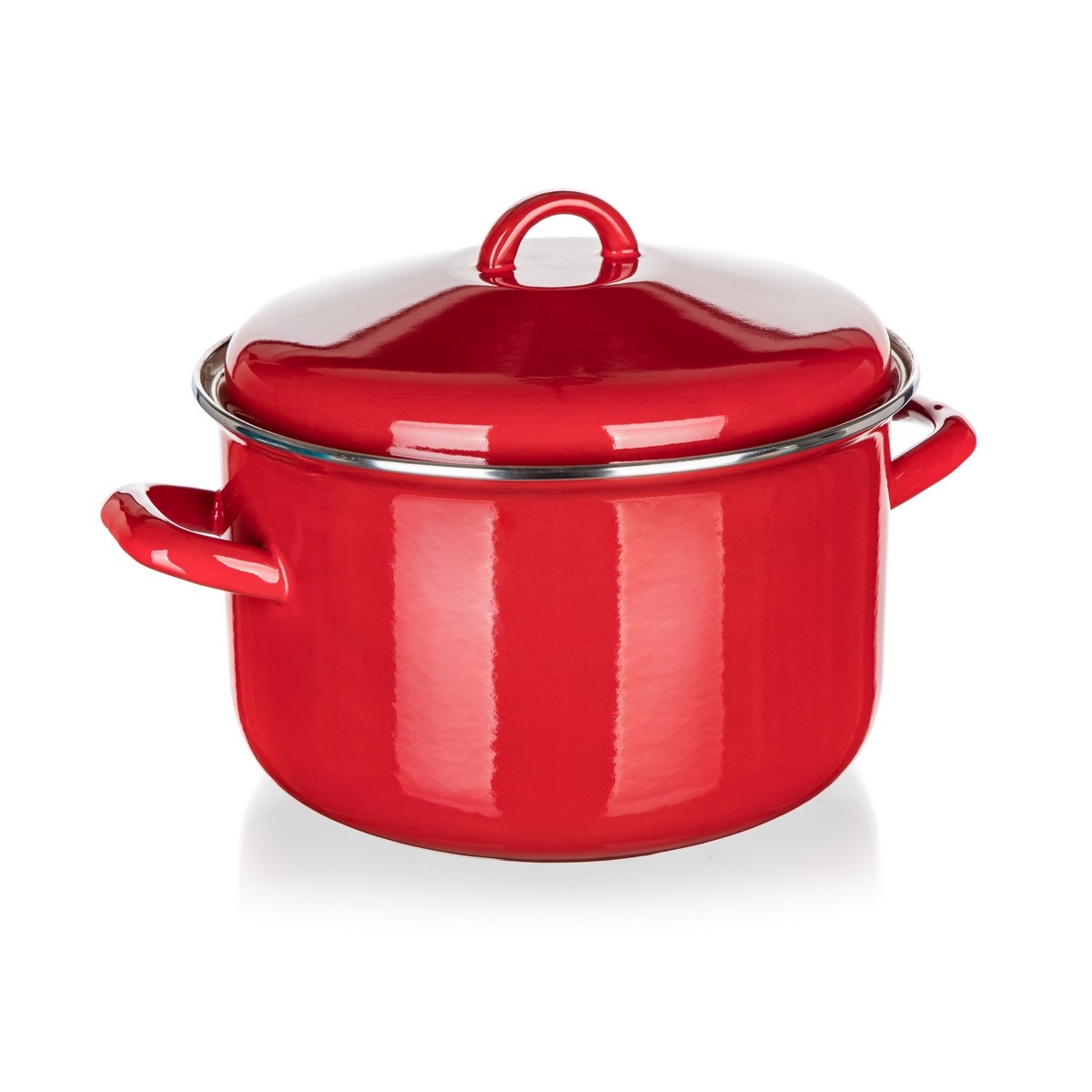 Smaltovaný hrniec Milton s objemom 5,9 l je skvelý pomocník na prípravu zdravých a chutných pokrmov. Pokrievka aj hrniec s červenou smaltovanou glazúrou, čiernym dnom na vonkajšej strane, s krémovou farbou na vnútornej strane. Hrniec je možné používať na všetky typy varných dosiek vrátane indukcie. Hrúbka steny 0,7 mm.