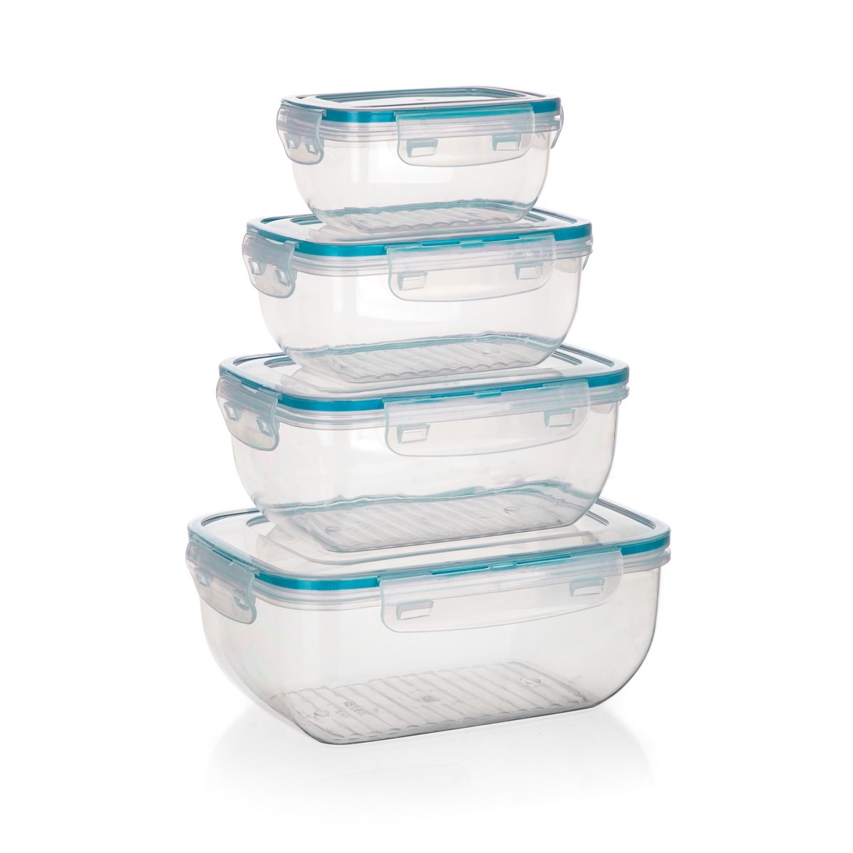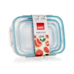 Praktická sada plastových dóz s viečkom Leya nájde uplatnenie aj vo vašej kuchyni. Ideálne na uchovávanie potravín v čerstvom stave alebo zmrazovanie. Tyrkysové silikónové tesnenie zaisťuje vzduchotesnosť dózy. Vďaka tomu zostávajú potraviny dlho čerstvé. Vhodné do umývačky a mikrovlnnej rúry (bez veka).Upozornenie: teplotné rozpätie -25 °C až 95 °C.Obsah sady: