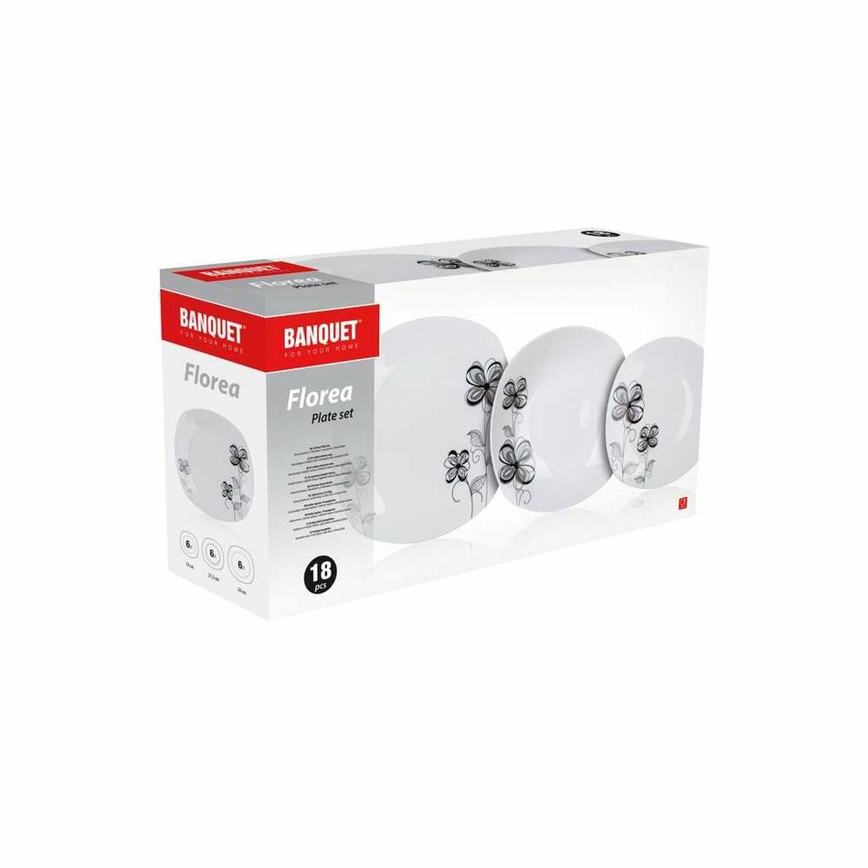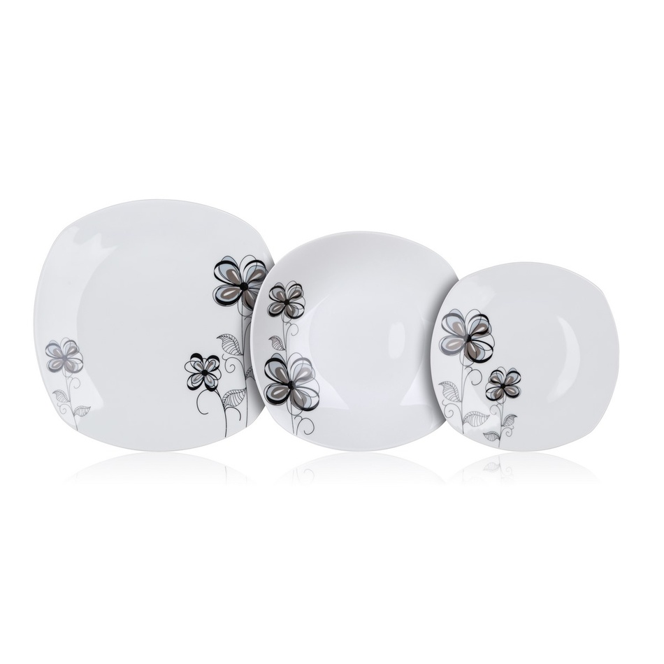 Elegantná jedálenská súprava so štvorcovým tvarom tanierov je vyrobená z kvalitného porcelánu a dekorovaná pekným kvetinovým motívom, ktorý krásne vyniká na čisto bielom podklade. Porcelán zaistí riadu pevnosť, lesk, hladký povrch a pekný vzhľad dlhú bodu.Súprava je vhodná pre každodenné používanie, umývanie v umývačke riadu i ohrievanie v mikrovlnnej rúre.Sada obsahuje: