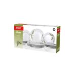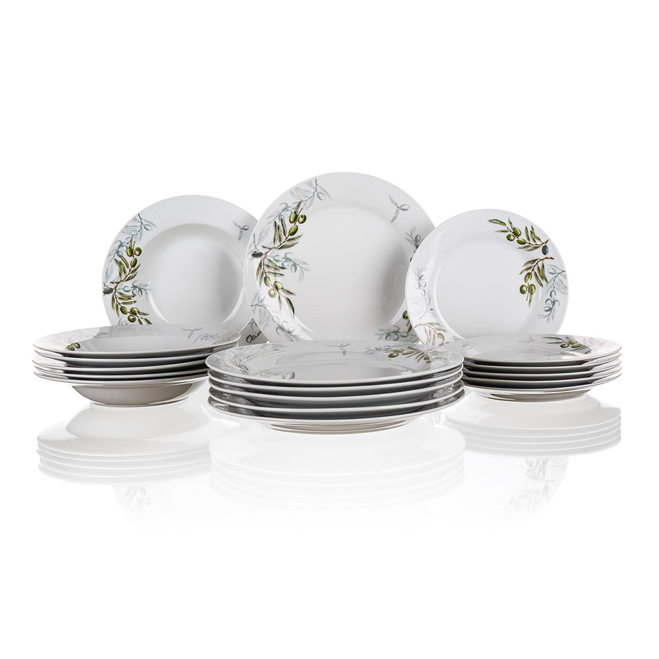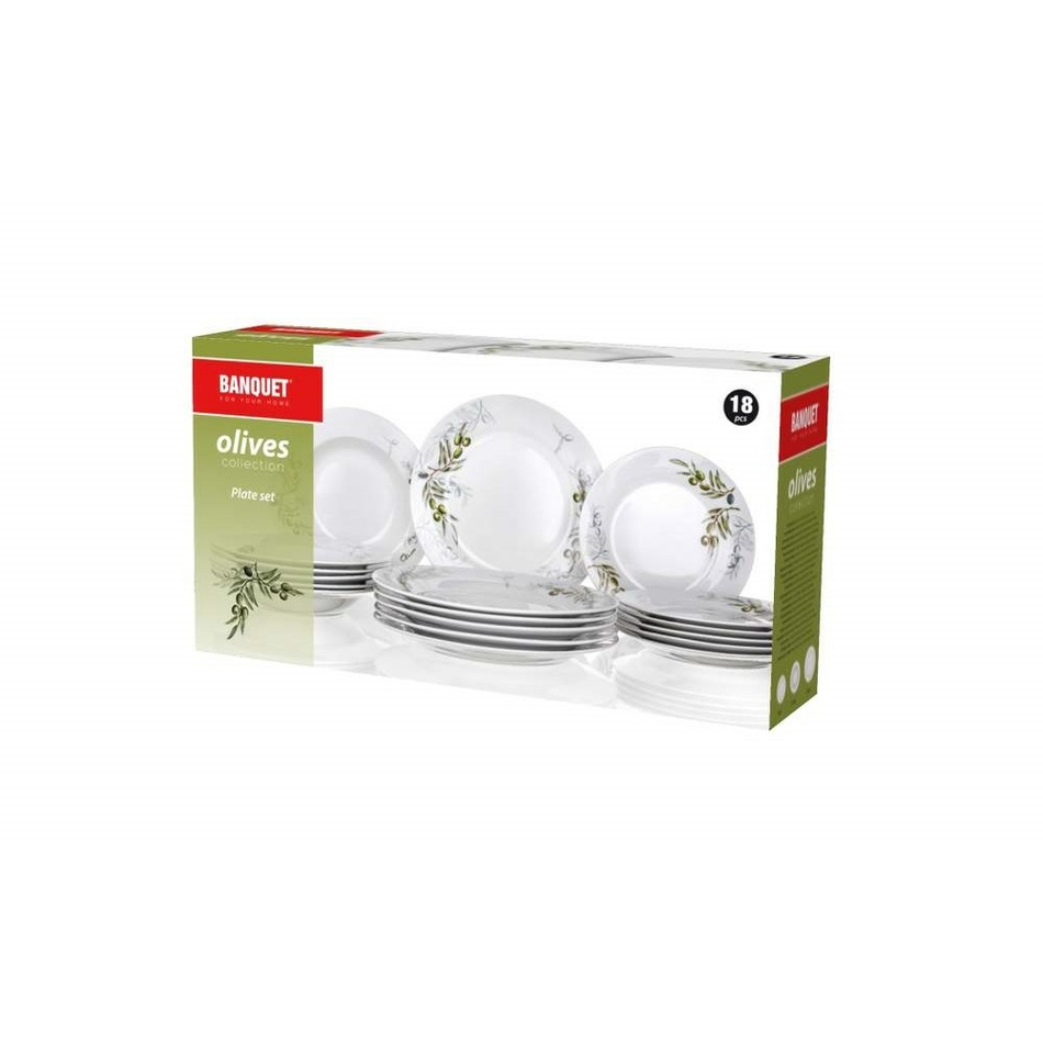 Banquet jedálenská súprava Olives v jednoduchom, ale štýlovom dizajne, bude ozdobou vašej jedálne. Súprava tanierov je vyrobená z porcelánu a skladá sa z 18 dielov, bez problému tak pohostíte aj väčšiu rodinu. Táto súprava je vhodná do umývačky riadu.Ochutnajte atmosféru stredomoria s jemným olivovým motívom. Kolekcia Olives v sebe spája jednoduchú eleganciu aj praktickosť. Svetlozelená farba oživí váš jedálenský stôl a povzbudí chuť k jedlu. Celú kolekciu nájdete TU.Súprava obsahuje: