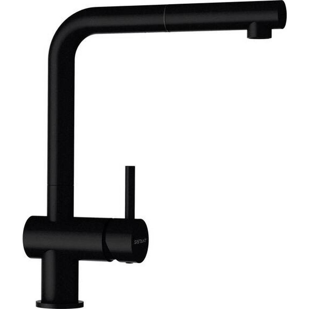 Nízkotlaková batéria, čierna, otočná o 180°, s výsuvnou sprškou a spätnou klapkou.
