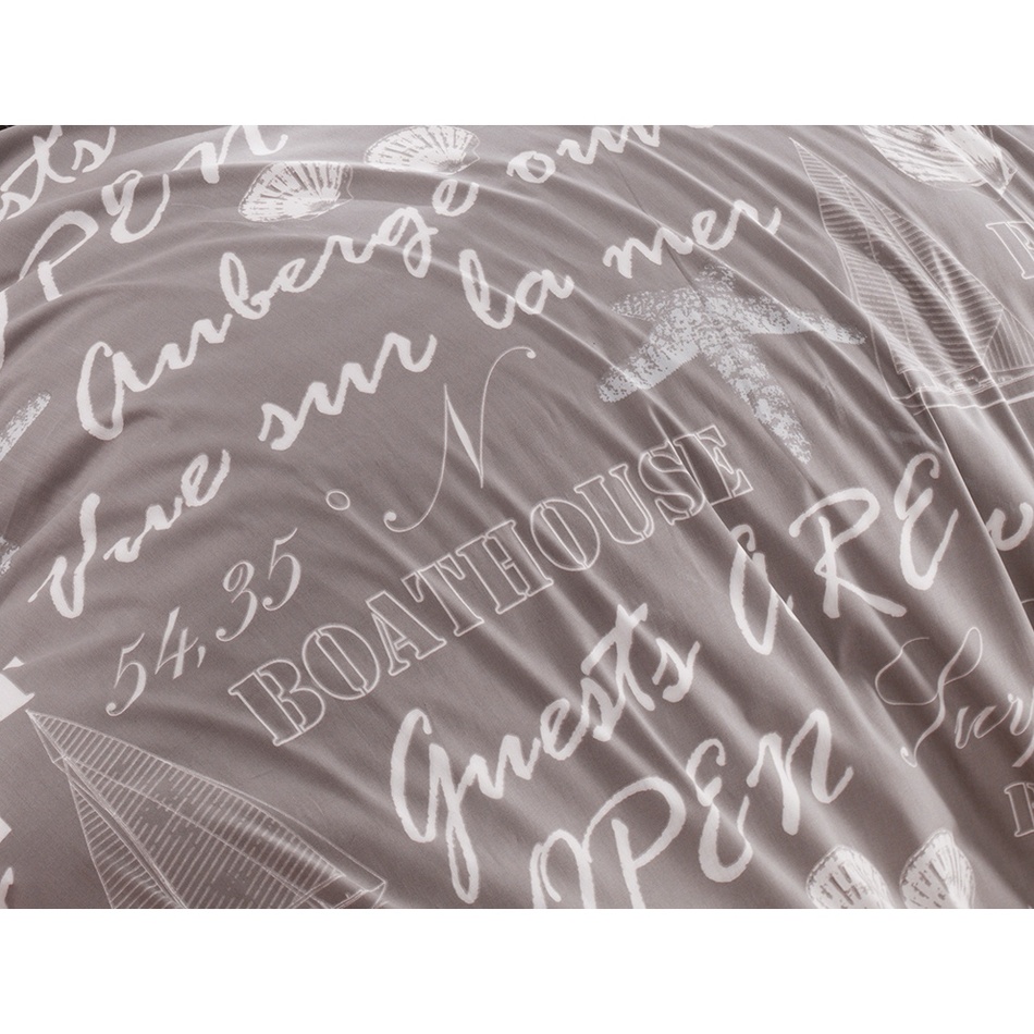 Posteľné obliečky sú vyrobené zo 100% hladkej bavlny renforcé. Bavlnené obliečky s morskou tematikou, prinesú do vašich spální pokoj a pohodu. Príjemná hnedo-sivá farba obliečok s bielymi vzormi mušlí, hviezdic, lodičiek a nápisov, vnesú do vašich spální vôňu diaľok. Obliečky budú tiež jemným doplnkom do spální, ktoré nehľadajú sýte farby, avšak napriek tomu túžia byť stále originálne. Pre maximálne pohodlie majú obliečky praktické zapínanie na zips. Obliečky majú certifikát Öko-Tex Standard 100. Obliečky perte vždy naruby, so zapnutým zipsom. Nepoužívajte pracie prostriedky s obsahom bieliacich a rozjasňujúcich substancií. Odstreďujte pri nižších otáčkach, aby nedošlo k polámaniu, a tak k trvalému poškodeniu bavlnených vlákien.Súprava obsahuje: