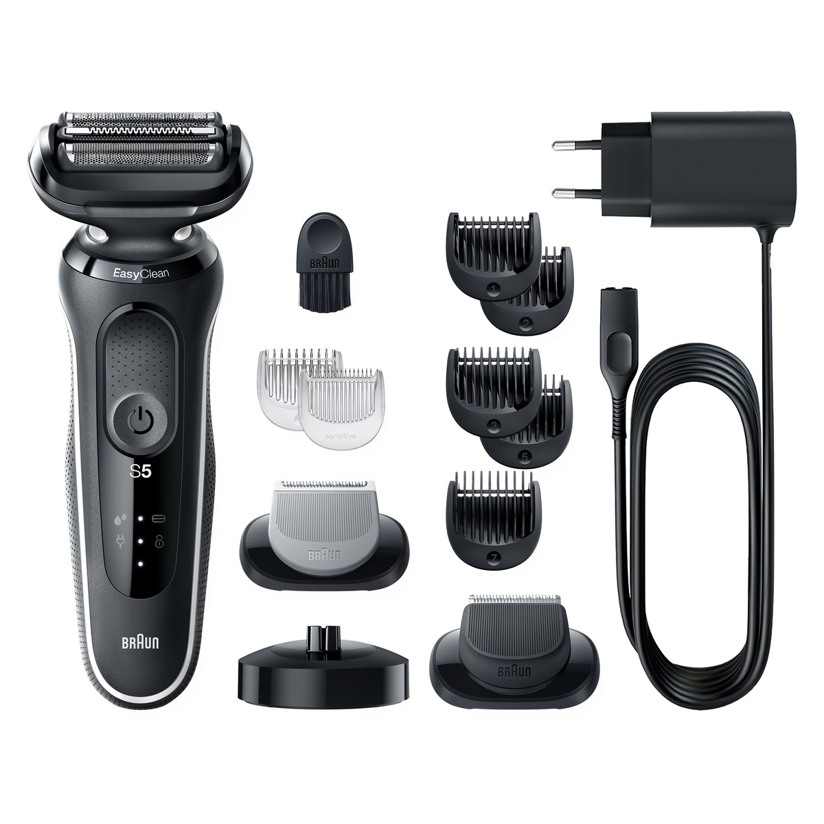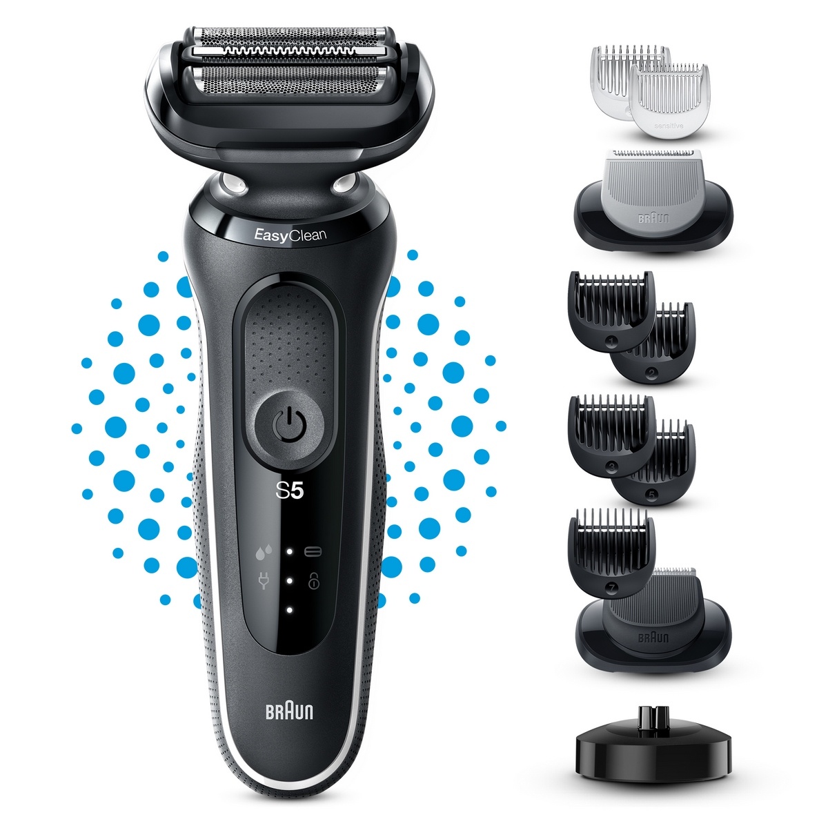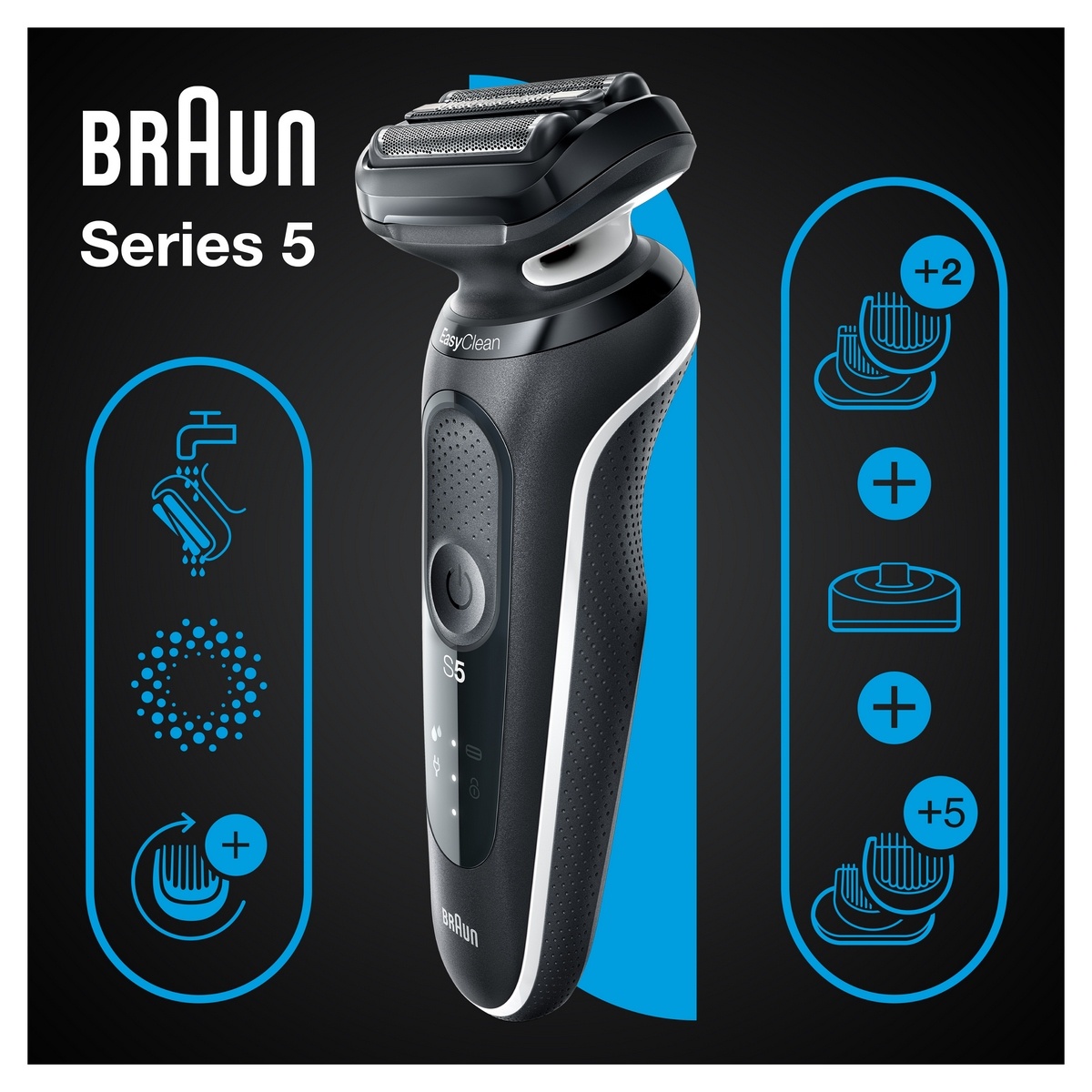 Elektrický holiaci strojček Braun Series 5 pre mužov uľahčuje holenie vďaka trom flexibilným čepieľkam, ktoré sa prispôsobujú kontúram vašej tváre. Systém EasyClean zaisťuje rýchle a jednoduché čistenie bez nutnosti zložiť holiacu hlavu. Lítium-iónová batéria pre až 3 týždne holenia a rýchle nabitie za 5 minút.Tento pánsky elektrický holiaci strojček je 100% vodotesný. Možné ho použiť za mokra aj za sucha. Kompatibilný so systémom EasyClick. Vrátane nadstavca na zastrihovanie fúzov a nadstavca na zastrihovanie chĺpkov na tele.Balenie obsahuje:
