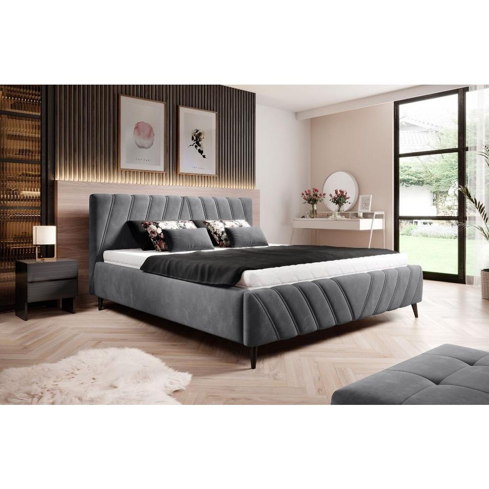 Tento výrobok je dostupný IBA ONLINE. Očarujúca čalúnená posteľ MELLI hneď na prvý pohľad upúta svojím jedinečným vzhľadom so sivým velúrovým poťahom a ozdobným prešívaním na vysokom záhlaví a nožnej časti. Čierne kónické nožičky, vysoké …