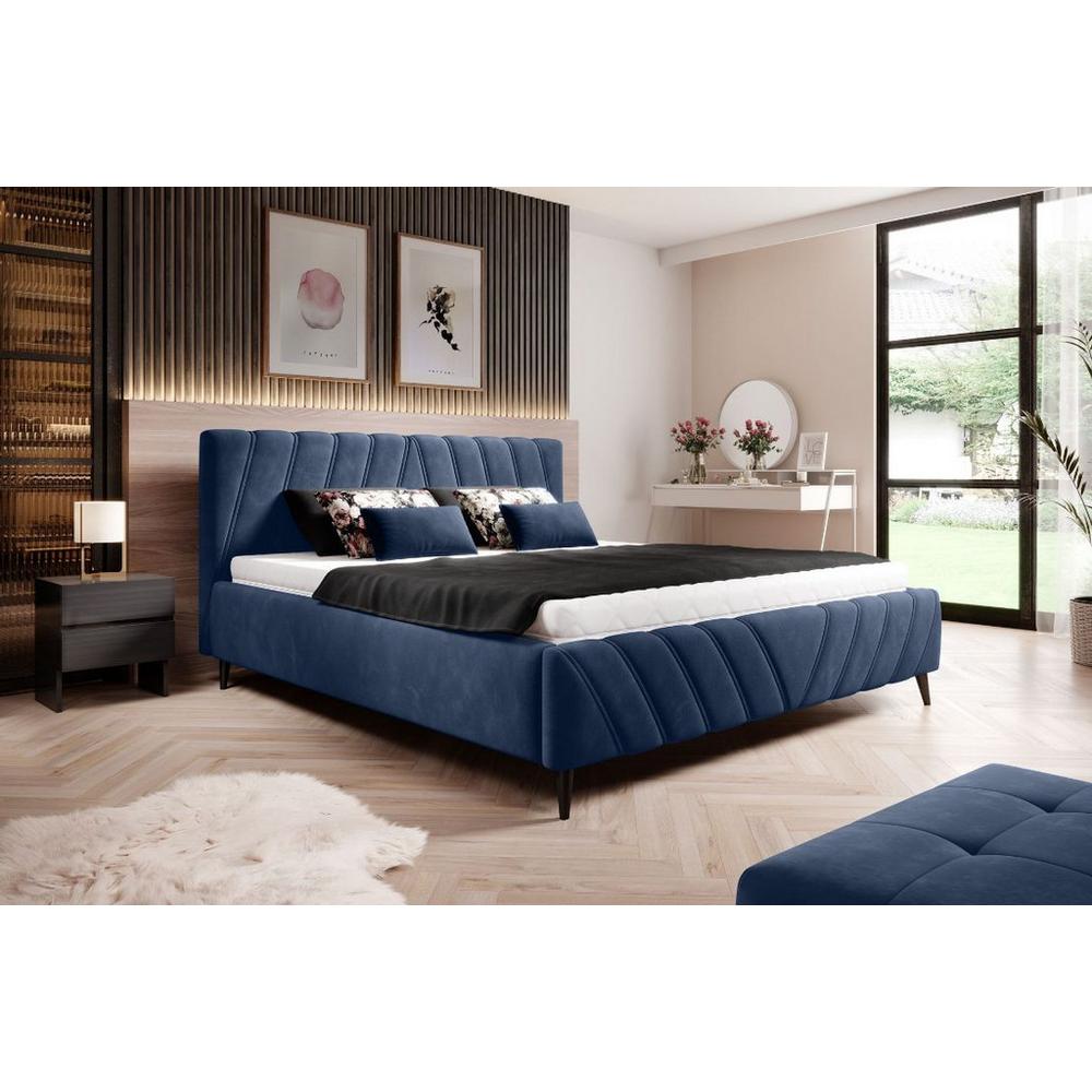 Tento výrobok je dostupný IBA ONLINE. Očarujúca čalúnená posteľ MELLI hneď na prvý pohľad upúta svojím jedinečným vzhľadom s modrým velúrovým poťahom a ozdobným prešívaním na vysokom záhlaví a nožnej časti. Čierne kónické nožičky, vysoké …
