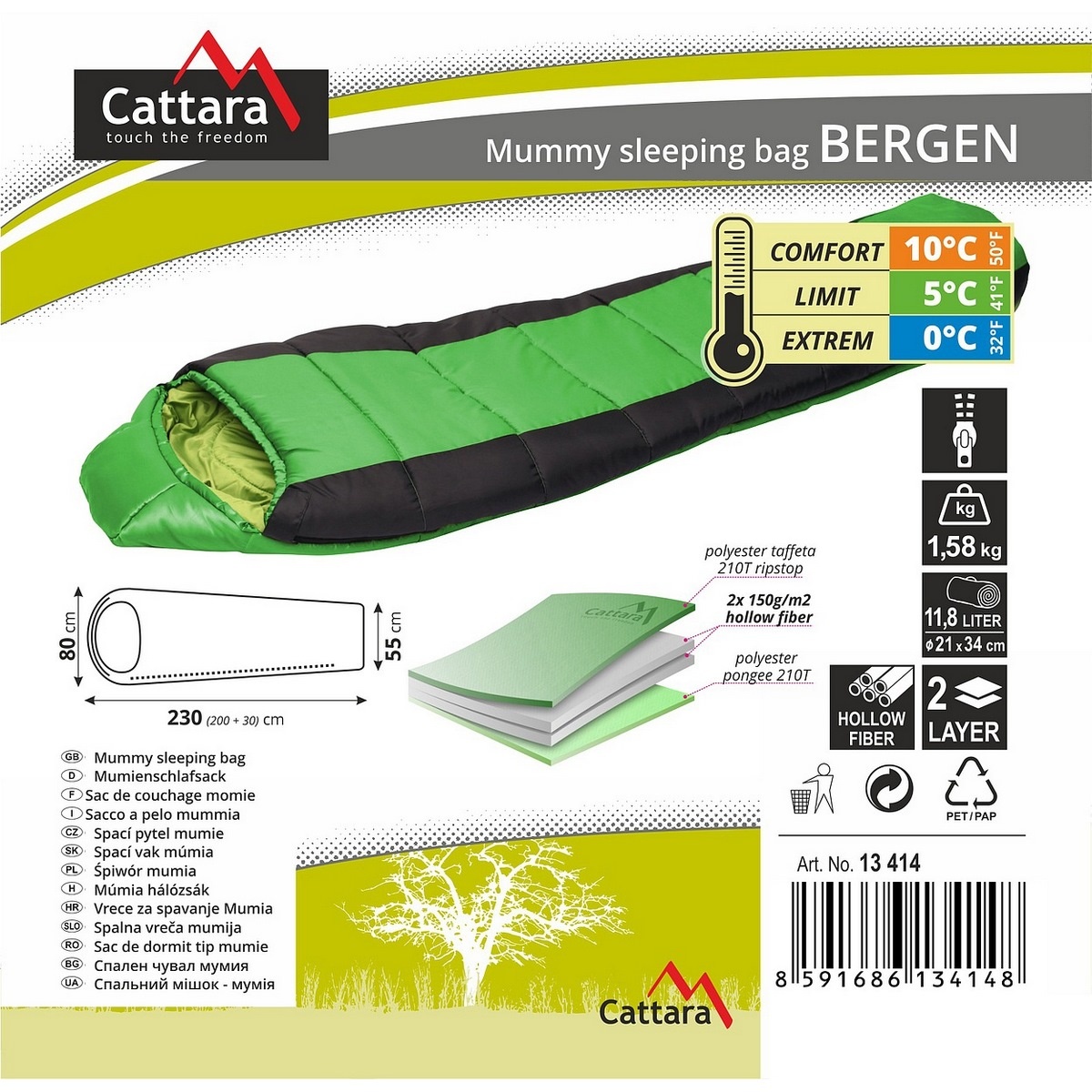 Tento spací vak dokonale kopíruje telo a má tak najlepšie tepelnoizolačné vlastnosti. Praktická je zatiahnuteľný kapucňa chrániaca hlavu. Je poskladaný zo štyroch vrstiev, vonkajší materiál je polyester taffeta 210T s povrchovou úpravou Rip-Stop, vďaka ktorej sa ďalej nezväčšujú prípadné vzniknuté trhliny materiálu. Ďalšou vrstvou je vnútorná, pripomínajúca príjemný hodváb a je z polyesteru 210T. Poslednou vrstvou je zdvojená vrstva izolačná z polyesterových dutých vlákien (hollow fiber), kedy každá z dvoch vrstiev má gramáž 150 g/m2. Duté vlákna zadržujú veľké množstvo vzduchu a zaisťujú rýchly odvod vlhkosti a zároveň majú výborné izolačné vlastnosti. Vhodný je najmä pri dlhšom pobyte v prírode.Na komfort a teplotu vo vnútri spacieho vaku má vplyv aj oblečenie. Spánok je doporučený len v spodnom prádle, prípadne s tričkom. Je totiž dôležité vyhriať si spacák a zbytočne neohrievať oblečenie. Spacáky vyberáme hlavne podľa ich teplotných limitov, kde comfort značí teplotu, pri ktorej nám bude príjemne, limit je teplota, pri ktorej ešte budeme v teple a v neposlednom rade je tu teplota extrem, ktorá udáva maximálnu únosnú teplotu.Technické parametre: