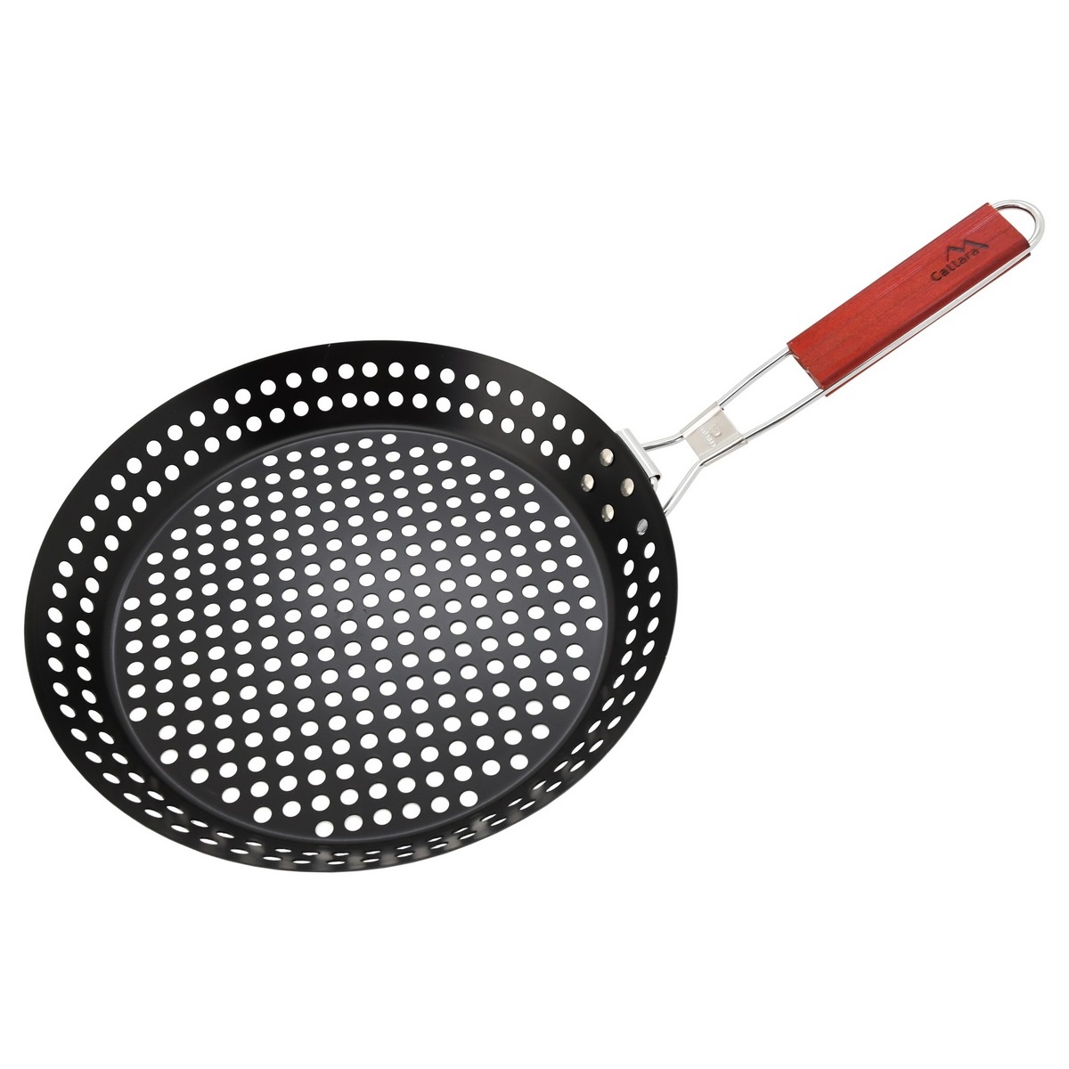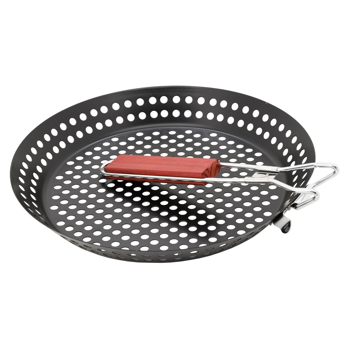 Táto dierovaná panvica so skladacou rukoväťou je ideálna pre grilovanie doma aj pri kempovaní. Uplatnenie nájde napríklad pri príprave plátkov zemiakov, rýb a iných pokrmov. Je vyrobená z kvalitnej ocele čierno-sivejfarby. Rukoväť má v úchopovej časti drevené obloženie pre pohodlnejší úchop.