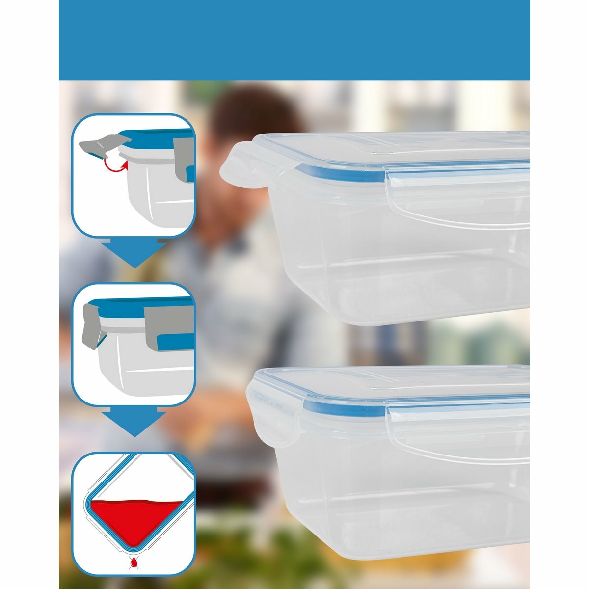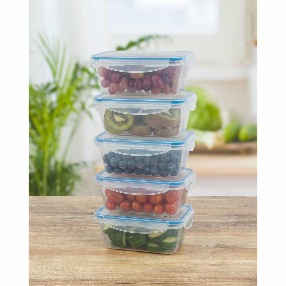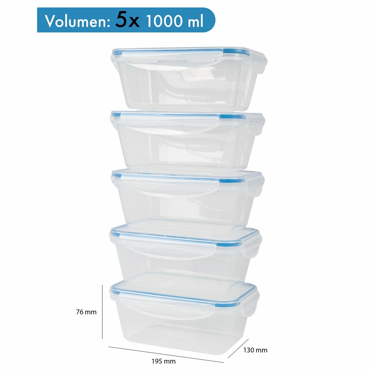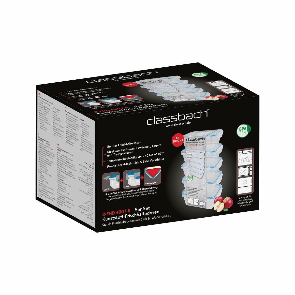 Sada 5 nádob na čerstvé potraviny na všestranné použitie. Ideálne na mrazenie, ohrev, skladovanie a prepravu potravín, ako sú jedlá, omáčky, zelenina, ovocie, vafle a detská výživa.Udržuje 100% tesnosť vďaka praktickému 4-cestnému zapínaniu Click and Safe a vysokej kvalite silikónového tesnenia vo veku. Jednoduchá manipulácia. Dlhotrvajúca sviežosť a aróma. Je možné ich stohovať alebo vkladať do seba, aby sa ušetrilo miesto. BPA free.Teplotná odolnosť od – 40 do + 110 °C.Objem: 5x 1000 ml.Rozmery nádoby: 19,5 x 7,6 x 13 cm.