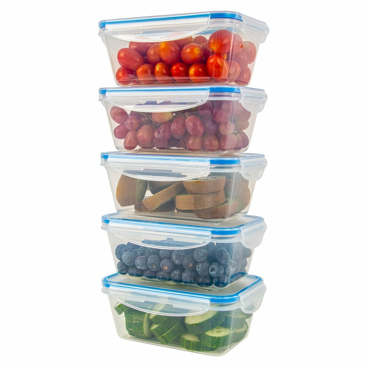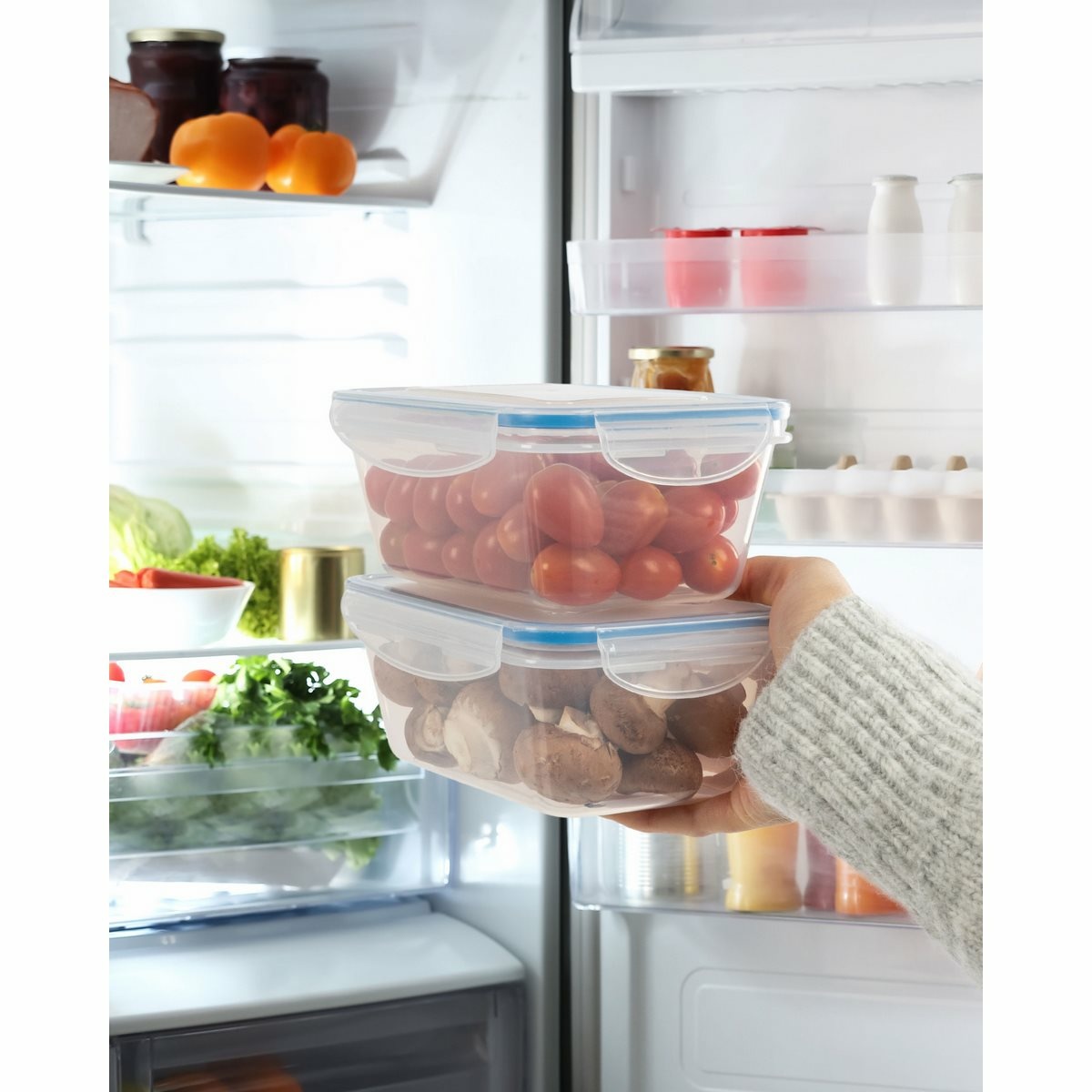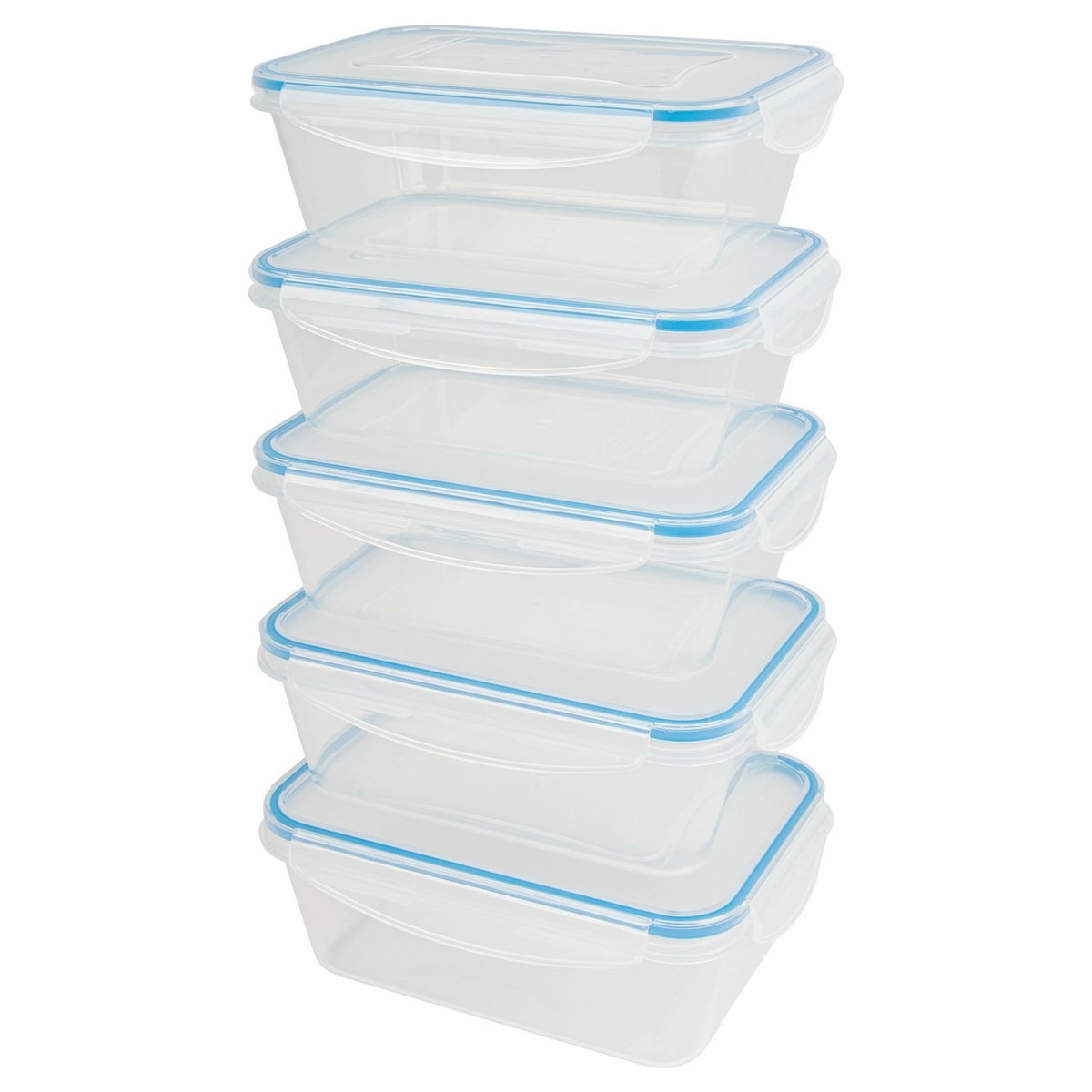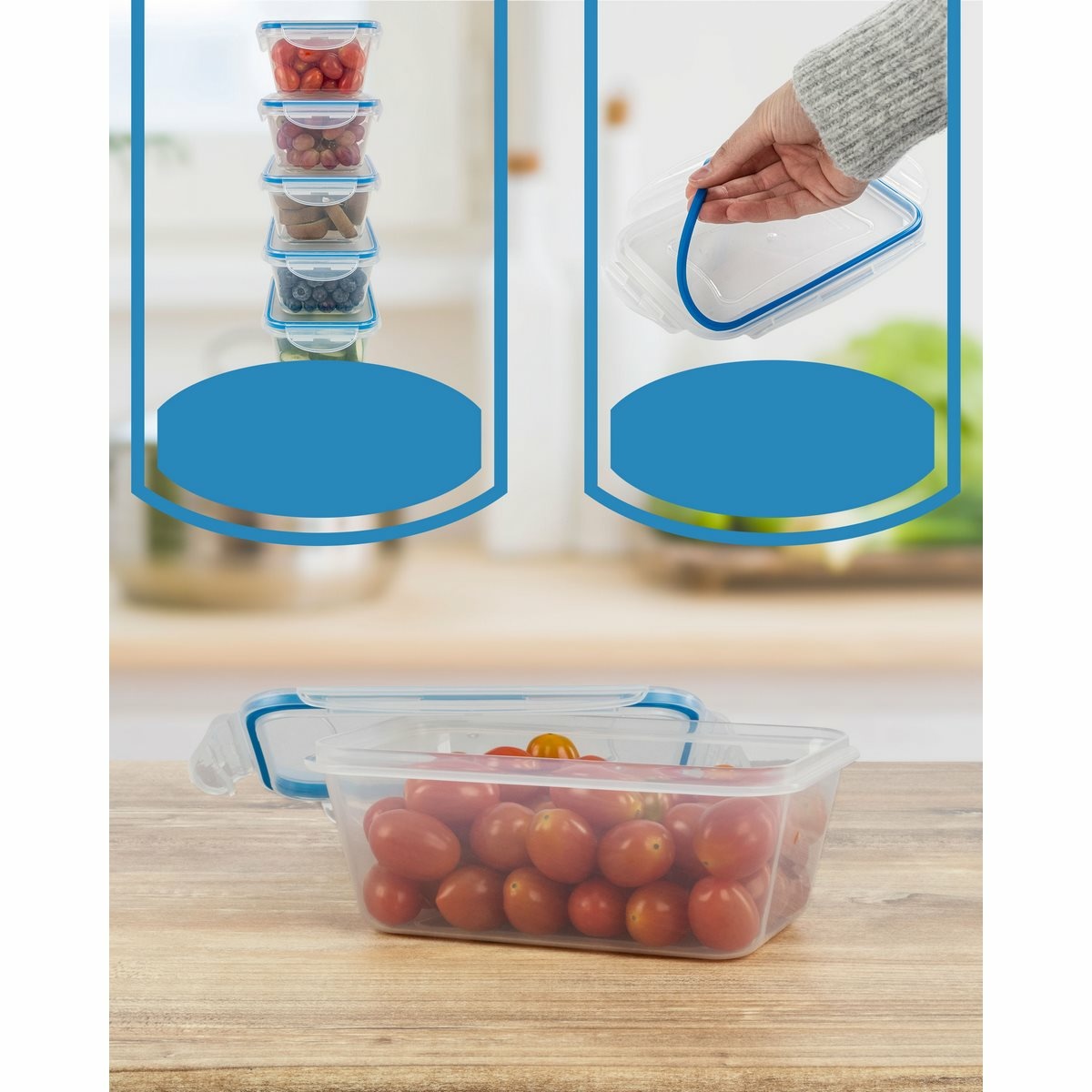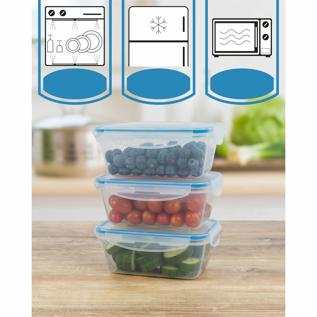 Sada 5 nádob na čerstvé potraviny na všestranné použitie. Ideálne na mrazenie, ohrev, skladovanie a prepravu potravín, ako sú jedlá, omáčky, zelenina, ovocie, vafle a detská výživa.Udržuje 100% tesnosť vďaka praktickému 4-cestnému zapínaniu Click and Safe a vysokej kvalite silikónového tesnenia vo veku. Jednoduchá manipulácia. Dlhotrvajúca sviežosť a aróma. Je možné ich stohovať alebo vkladať do seba, aby sa ušetrilo miesto. BPA free.Teplotná odolnosť od – 40 do + 110 °C.Objem: 5x 1000 ml.Rozmery nádoby: 19,5 x 7,6 x 13 cm.