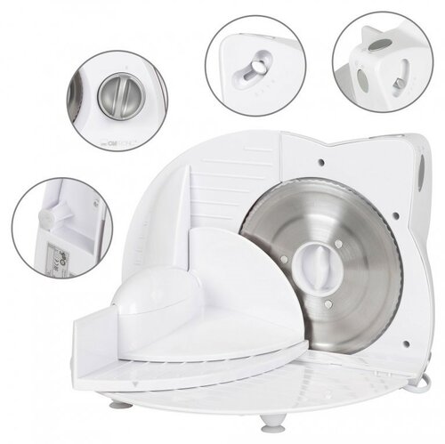 Krájač s výkonným 130 W motorom je ideálnym pomocníkom pri krájaní chleba, šunky, syra alebo ďalších potravín, ktoré je potrebné mať ukrojené rovnomerne. K tomu pomôže hrúbkomer. Nôž je vyrobený z ušľachtilej ocele. Krájač je možné prevádzkovať v 3 rýchlostiach – pomalá, stredná, rýchla. Krájač je vybavený bezpečnostným spínačom, takže by deti nemali byť schopné krájač spustiť. Navyše je súčasťou balenia aj posuvný vozík s chráničom ruky pre čo najväčšie bezpečie.Parametre:
