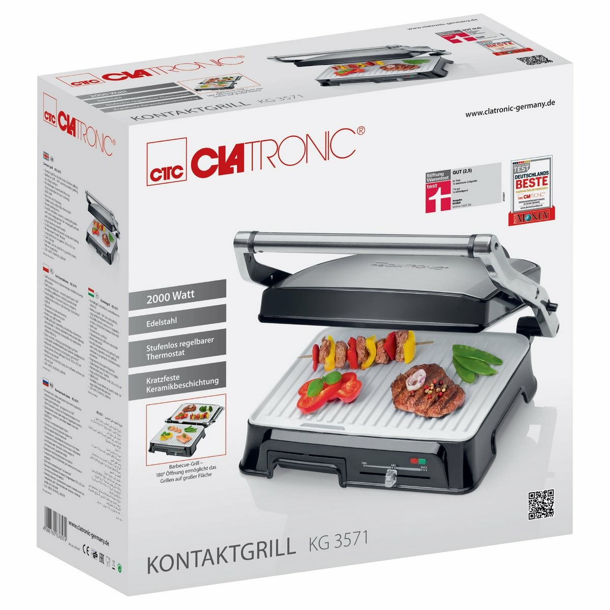 Clatronic KG 3571 kontaktný keramický gril je ideálny na obojstranné grilovanie bez tuku. Prístroj môžete univerzálne použiť napr. na panini, steaky, ryby alebo zeleninu. Je možné ho otvoriť na 180°, čím umožňuje grilovanie na veľkej ploche.Prístroj má drážku na odvádzanie tuku a odkvapkávací zásobník, ktorý je možné jednoducho vybrať a vyčistiť. Telo prístroja je vyrobené z nehrdz. ocele a termostat je plynule nastaviteľný. Keramické dosky sú odolné voči poškriabaniu – hladký a hrubý vzor. Veľké rukoväte sú tepelne izolované, takže nehrozí, že by ste sa o ne popálili. 2 kontrolky prevádzky ukazujú, za je prístroj napájaný a nahrieva sa.Grilovacie plochy majú rozmer 2x 29,5 cm x 23,5 cm.Gril má tiež úložný priestor pre napájací kábel.Napájanie: 220-240 V, 50/60 Hz.