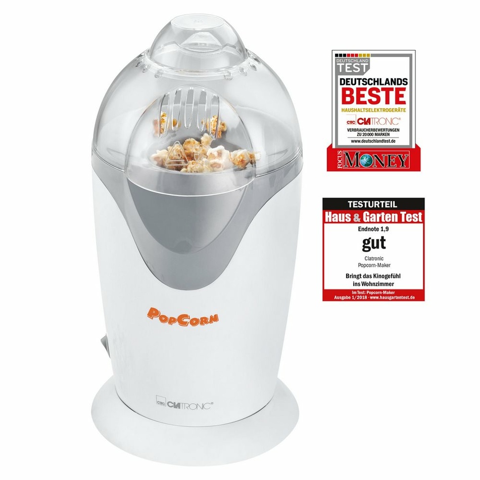 Clatronic PM 3635 je prístroj na výrobu popcornu. Iste ho ocenia milovníci tejto pochúťky, oslávenci na svojich oslavách alebo tí, ktorí si chcú pri sledovaní filmu navodiť atmosféru kina. Originálny retro štýl spojený s červenou farbou si iste každý zamiluje. Počas necelých 2 minút si v Clatronic PM 3635 môžete pripraviť až 3 porcie. Veľkou výhodou tohto prístroja je v tom, že kukurica je pripravovaná špeciálnou metódou horúceho vzduchu, takže nie je potrebný žiadny tuk a váš popcorn môže byť zdravá pochúťka.