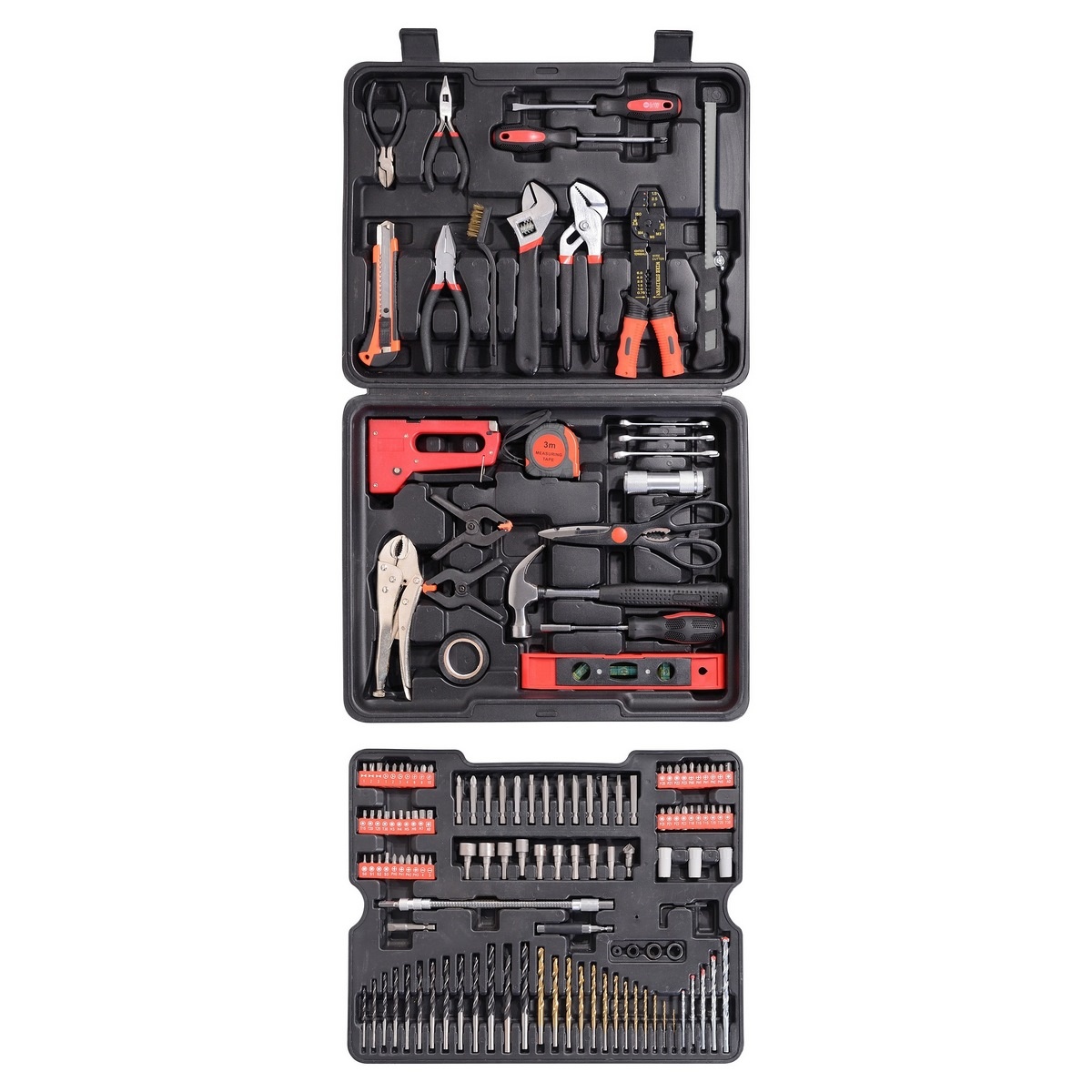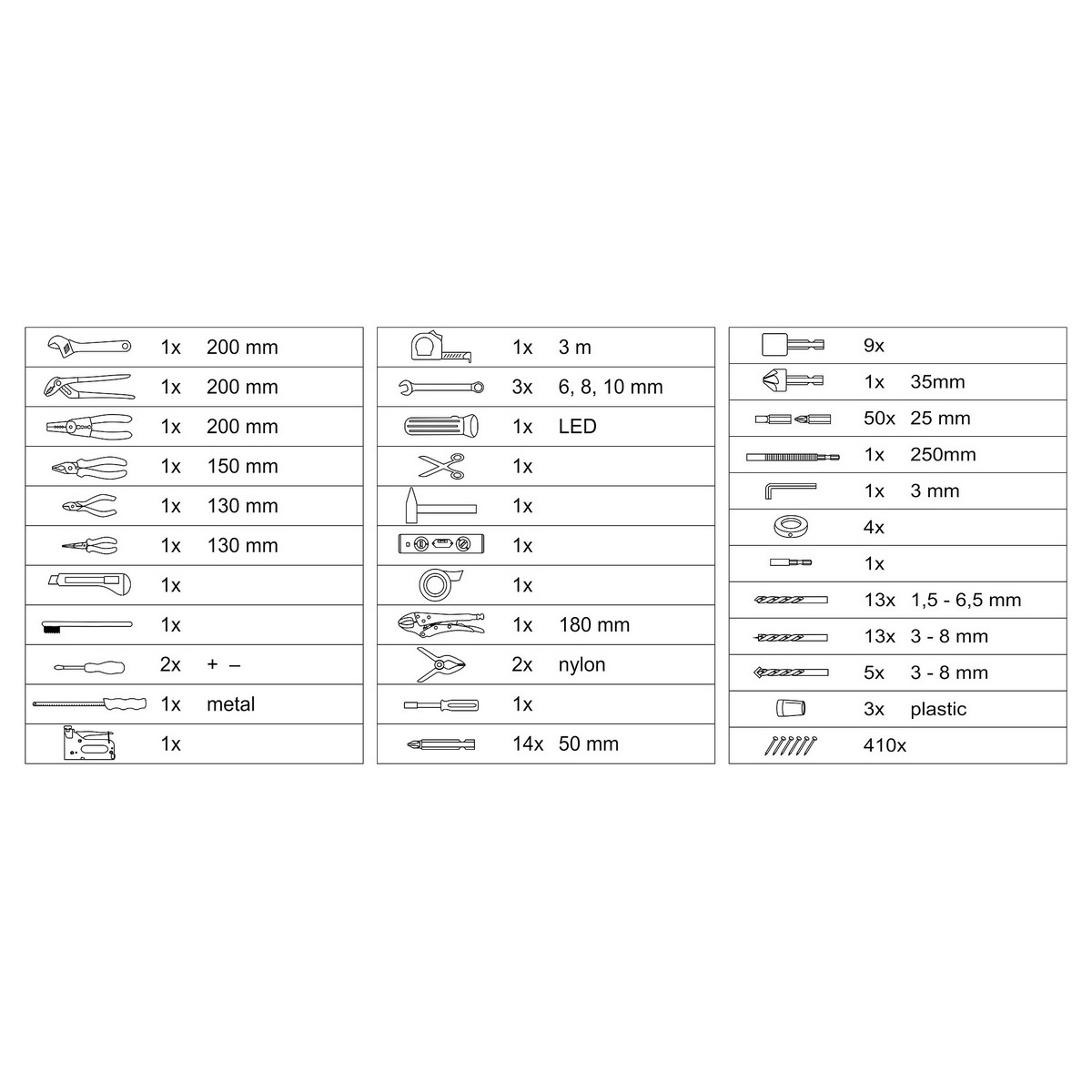 Tento praktický kufrík sa bude hodiť každému domácemu majstrovi. Všetko usporiadané v prehľadných pozíciách, vo vnútri je navyše jedno plato s nástrojmi. Spojovací materiál je umiestnený vo veku kufra.Sada obsahuje: