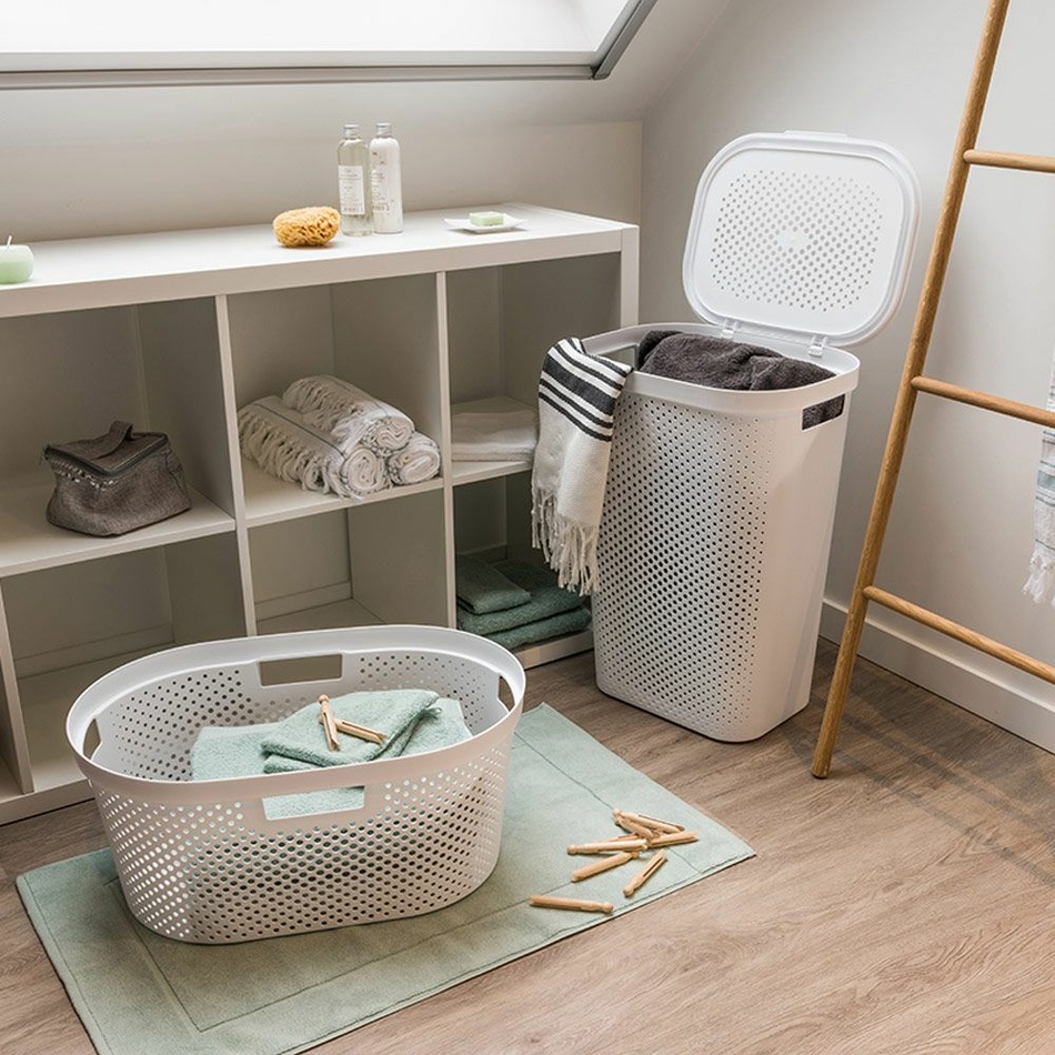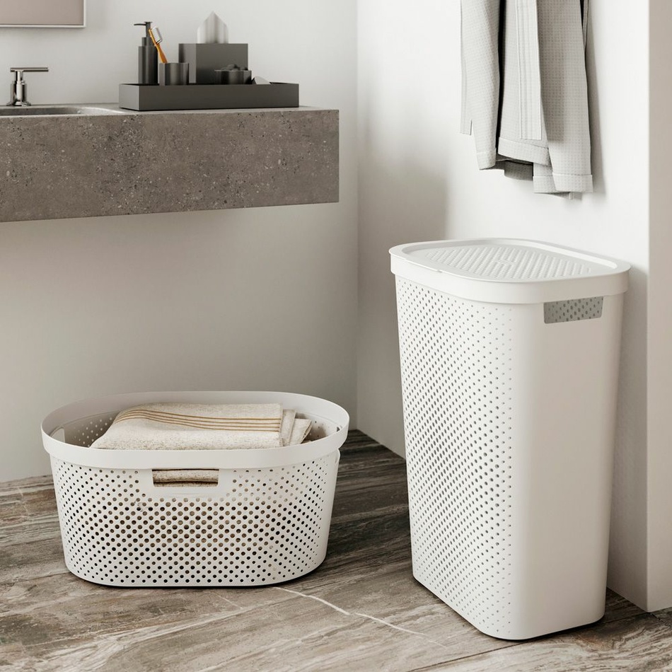 Kôš na bielizeň INFINITY z recyklovaného plastu, bude praktickým pomocníkom každej gazdinky pri praní a sušení. Vďaka zaujímavému dizajnu pripomínajúcom ratan bude tiež pekným doplnkom každej kúpeľne. Tvarované držadlá umožnia jednoduché prenášanie koša podľa potreby. Vďaka drobným otvorom po celej ploche koša je zaistená dostatočná vetrateľnosť. Použitý materiál zabezpečí jednoduchú údržbu.