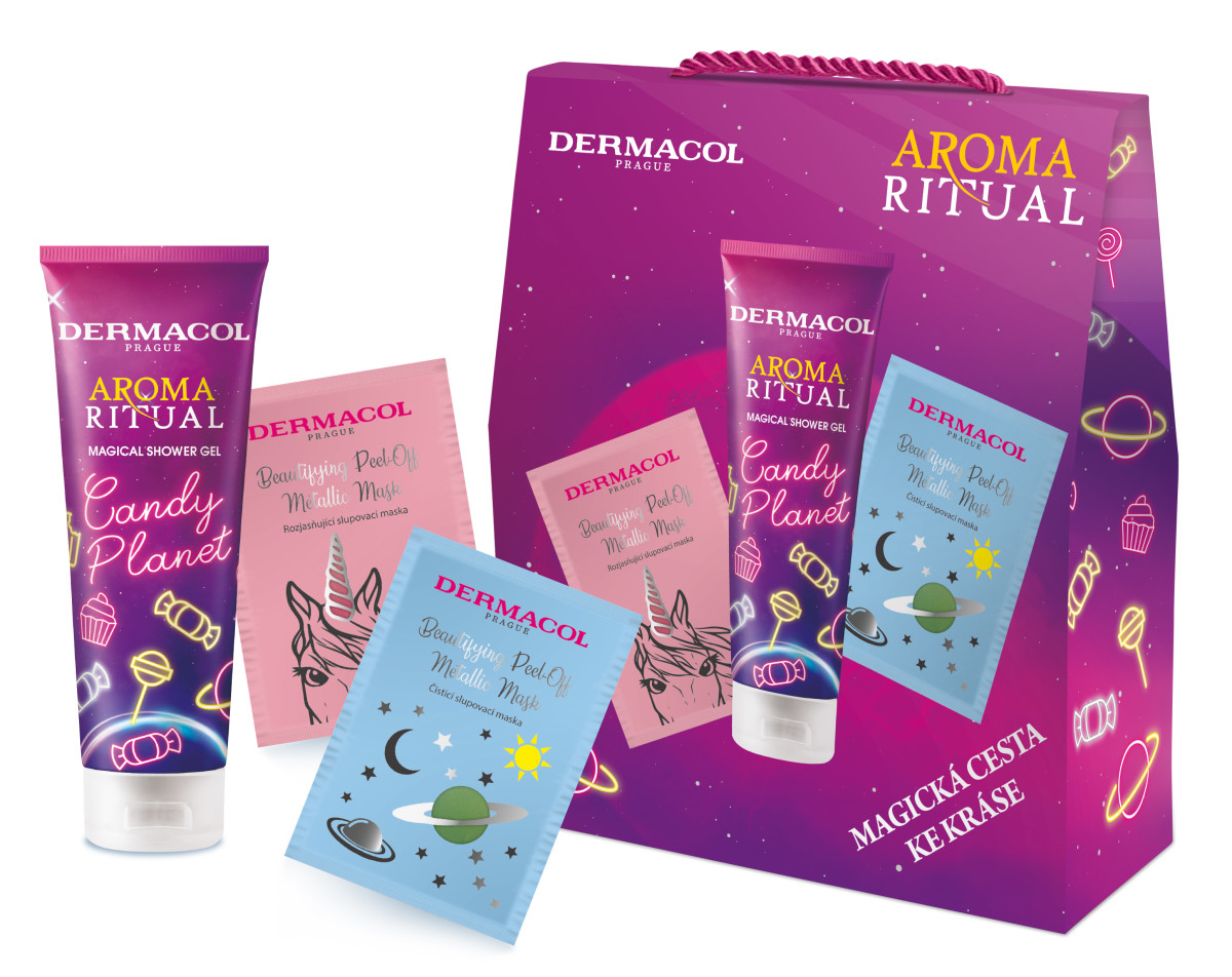 Darčeková sada Candy planet od Dermacolu je vhodná pre veľké i malé slečny od 10 rokov. Vôňa sladkých ingrediencií prevonia pokožku i kúpeľňu. Produkty sú vhodné pre všetky typy pleti.Magický set obsahuje:Rozjasňujúcu zlupovaciu masku (15 ml) s metalickým efektom a s obsahom marhuľového oleja. Zbavuje pleť odumretých buniek a nečistôt. Obsah sáčku naneste na celú tvár okrem očí, obočia a pier. Nechajte cca 15 min zaschnúť a potom zlúpnite. Zvyšky očistite micelárnou vodou. Čistiacu zlupovaciu masku (15 ml) s metalickým efektom a s obsahom extraktu z uhorky. Obsah sáčku naneste na celú tvár okrem očí, obočia a pier. Čistí a osviežuje pleť. Nechajte cca 15 min zaschnúť a potom zlúpnite. Zvyšky očistite micelárnou vodou.Magický sprchový gél Aroma Ritual Candy Planet 250 ml s obsahom trblietok (pre deti od 3 rokov). Pre vláčnu a prevoňanú pokožku.Darčeková sada Candy planetOmamná vôňa sladkostíPre veľké i malé slečny od 10 rokovVhodná pre všetky typy pleti