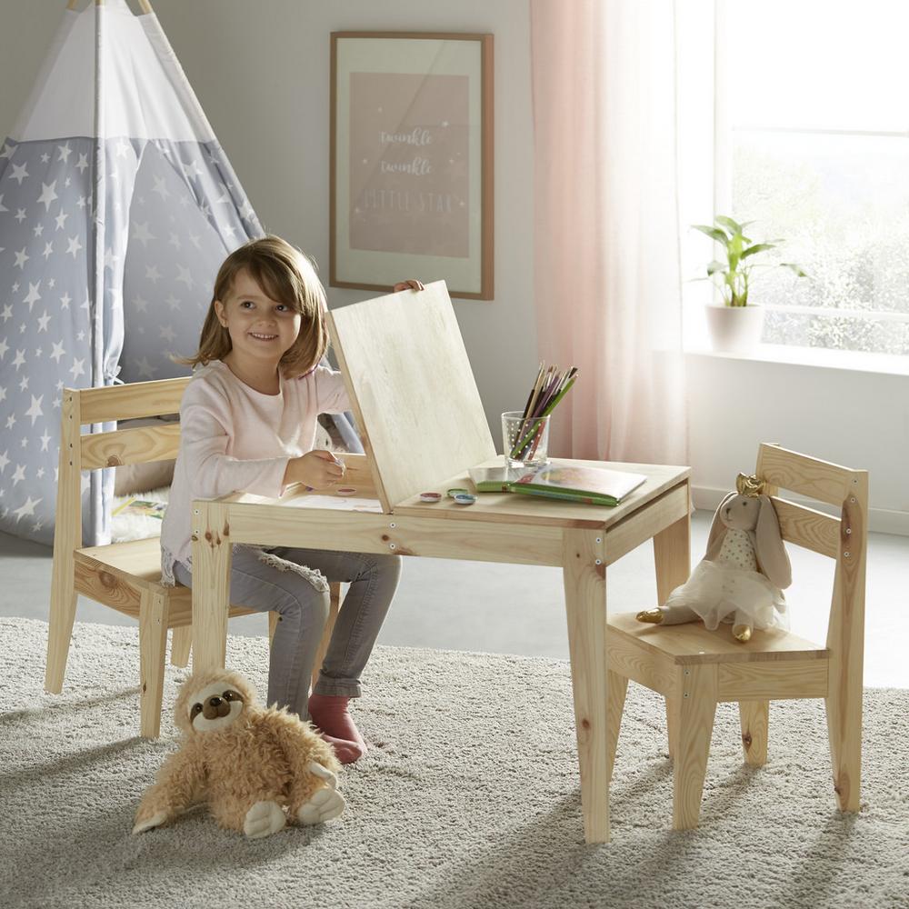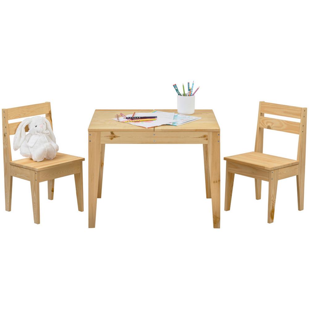 Detská sedacia súprava z masívnej borovice v prírodnej farbe,1 obdĺžnikový stôl a 2 stoličky. Stôl má výklopnú dosku s úložným priestorom. Drevo je bez povrchovej úpravy. Určené pre deti od cca 1 -10 rokov, nosnosť cca 20 kg.