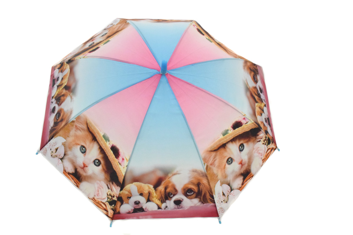 Ako urobiť našim najmenším z daždivej nepohody radosť?Detský vystreľovací dáždnik s motívmi mačiatok a šteniatok to dokáže jediným stlačením uzáveru. Vystreľovací mechanizmus je dokonale bezpečný pre detskú manipuláciu. K zahnutej plastovej rukoväti je prichytená voľne visiaca píšťalka vo farbe rukoväte, ktorá dodá daždivému dňu ešte veselší rozmer. Špička dáždnika je bezpečná a zaoblená. Samozrejmosťou je obmedzenie ostrých hrán a zaoblenie koncoviek drôtov. Spevnená 8dielna konštrukcia je potiahnutá mäkkým a poddajným PVC, odolným proti pokrčeniu a poškriabaniu, príjemným na pohmat.