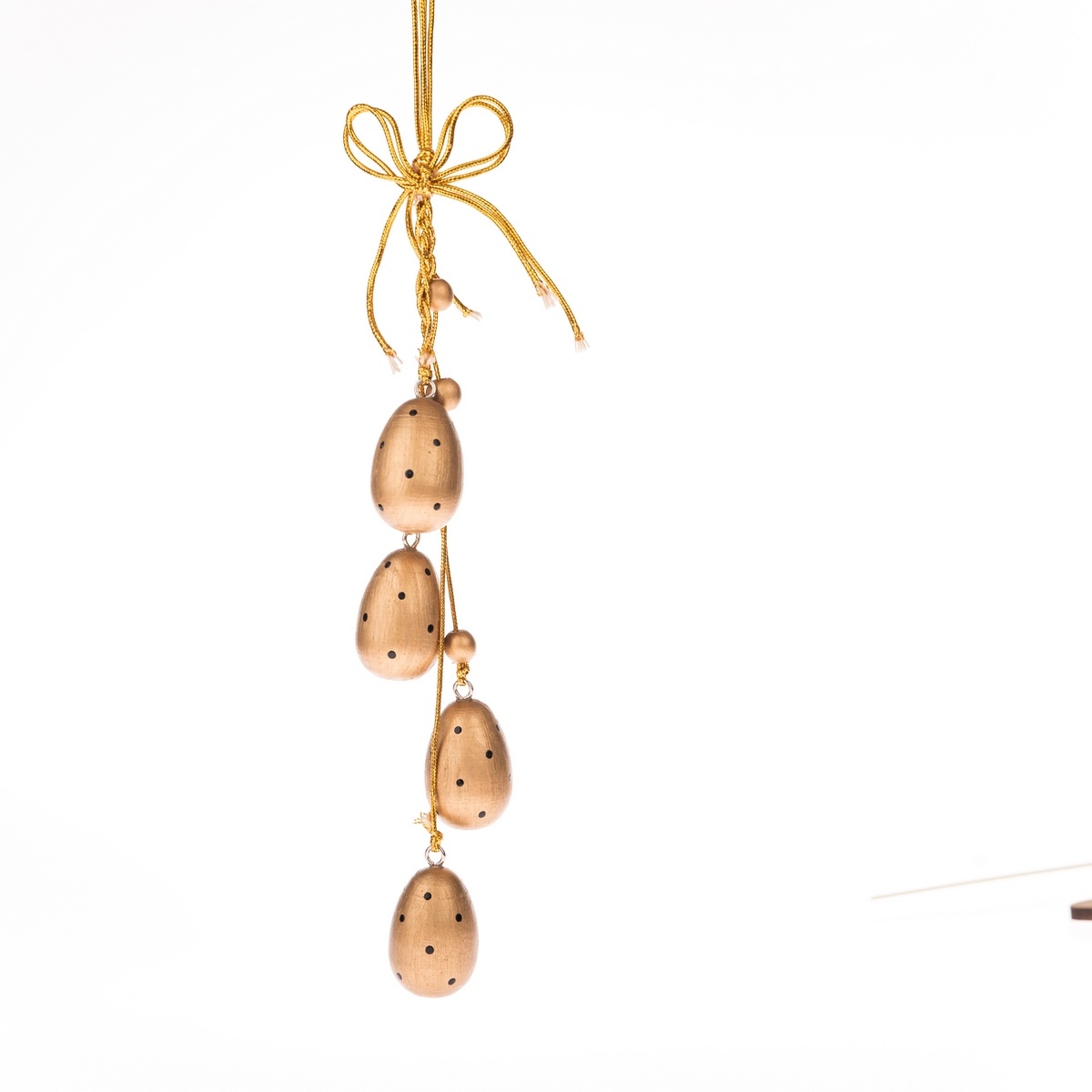 Drevené závesné veľkonočné vajíčka v zlatom prevedení s čiernymi bodkami doladia vašu veľkonočnú výzdobu. Dekorácia je vhodná na zavesenie. Celková dĺžka zavesenej dekorácie je 32 cm, veľkosť jedného vajíčka cca 2,5 x 3 cm.