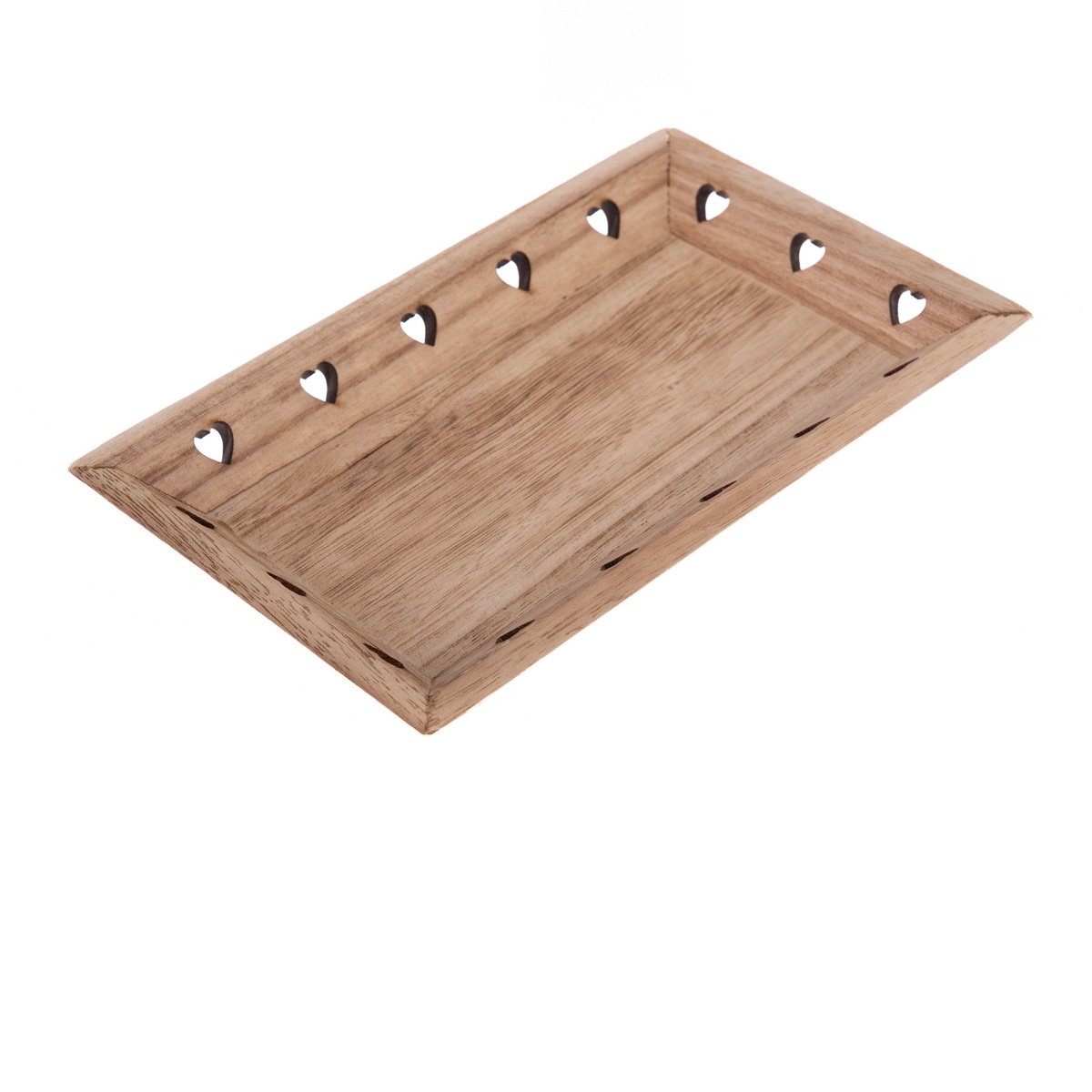 Drevený podnos s decentnými výrezmi v tvare srdiečok v prírodnom prevedení nájde svoje uplatnenie v každej domácnosti, vďaka svojej rozmanitosti použitia. Drevený podnos skvele poslúži ako tácka na servírovanie pochutín či nápojov. Každé posedenie s rodinou či priateľmi uvitá praktický doplnok v podobe podnosu, ktorý ochráni povrch vášho stola pred prípadným znečistením.Podnos je možné skvele využiť aj ako základ pre dekoračné kompozície a ako podtácku pod sviečky, vďaka čomu bude opäť chránený povrch stola a váš interiér očarí vami vytvorenou dekoráciou každého hosťa.