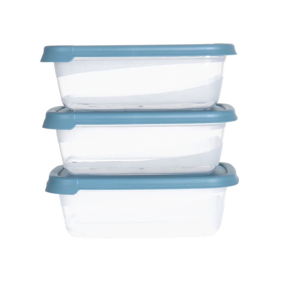 Sada 3 plastových dóz na potraviny je ideálna na skladovanie a prenášanie akéhokoľvek pokrmu. Dózy je možné poskladať do jednej, čím ušetríte miesto na skladovanie. Možné využiť v mikrovlnnej rúre, mrazničke aj umývačke riadu. Dodávame v dvoch farebných variantoch (sivá, modrá) bez možnosti výberu.