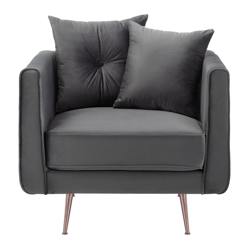 Tento tovar je k dispozícii IBA ONLINE.Toto atraktívne sivé kreslo má všetko, čo si vyžaduje, aby sa stalo novým obľúbeným miestom. Kreslo s rozmermi približne 90 x 87 x 87 cm (Š x V x H) zaujme štýlovým hranatým tvarom a mäkkým zamatovým poťahom zo 100% polyesteru. Podrúčky majú rozmer približne 12 x 72 cm (Š x V) a zaisťujú optimálny komfort sedenia. Okrúhle nožičky vo farbe ružového zlata podčiarkujú atraktívny vzhľad. Súčasťou dodávky sú 2 ozdobné vankúše vyplnené penou. Kreslo je možné zaťažiť maximálne 120 kg.Tento tovar sa nenachádza na našich predajniach. Objednať si ho môžete cez e-shop Möbelix.