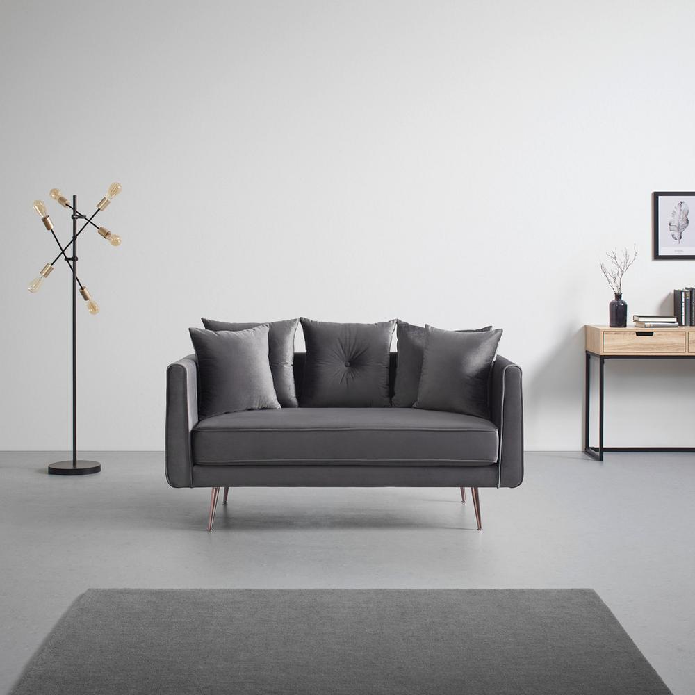 Tento tovar je k dispozícii IBA ONLINE.Táto sivá pohovka ponúka čistý relax. Plyšový mäkký zamatový poťah zo 100% polyesteru vyzerá nielen veľmi elegantne, ale aj mimoriadne útulne a pohodlne. Pohovka s rozmermi približne 155 x 87 x 87 cm (Š x V x H) je tiež vybavená mäkkými vankúšmi vyplnenými pohodlnou penou. Približne 12 cm široké podrúčky pozývajú zdržať sa. Okrem toho pohovka boduje penovým čalúnením. Obzvlášť krásne sú ružovo-zlaté nohy. Je určená pre 2 osoby. Toto bude zaručene nové obľúbené miesto!Tento tovar sa nenachádza na našich predajniach. Objednať si ho môžete cez e-shop Möbelix.