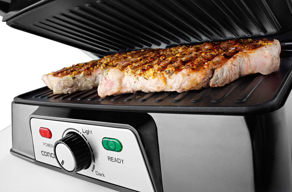 Elektrický kontaktný gril Concept GE 2005 umožňuje BBQ grilovanie na oboch roztvorených doskách zároveň. Gril je vybavený praktickým regulátorom teploty. Špeciálne upravená plocha grilovacích dosiek odvádza prebytočný tuk a šťavu do zbernej nádobky. Pripravované mäso tak bude skutočne grilované a šťavnaté, nie dusené. Na pohyblivej hornej platni môžete ľahko pripraviť aj talianske panini. Kvalitné nepriľnavé liatinové platne zaisiaí Vášmu grilu dlhú životnosť. Môžete ho používať doma aj vonku. Pri použití v kuchyni odporúčame gril postaviť pod odsávač pár. Údržba grilu je veľmi jednoduchá. Grilovacie dosky stačí len utrieť papierovou utierkou. Príkon 1500 W umožní rýchle zahriatie grilu a umožní perfektné prepečenie i vysokých steakov. Rozmery: 33 x 12,4 x 28 cm. Vyrobila spoločnosť Concept.Elektrický kontaktný gril Concept GE 2005Kvalitné nepriľnavé dosky potiahnuté teflónomRozmery dosiek: 278 x 170 mmBBQ – možnosť grilovať na oboch platniach zároveňNádobka na odkvapkávajúcu šťavu a tukTepelne izolované držadlá s nekĺzavým povrchomRegulátor teplotyJednoduché čistenie obrúskomMožnosť servírovania priamo na grilovacích doskáchPríkon: 1500 WNapätie: 220 – 240 V