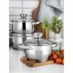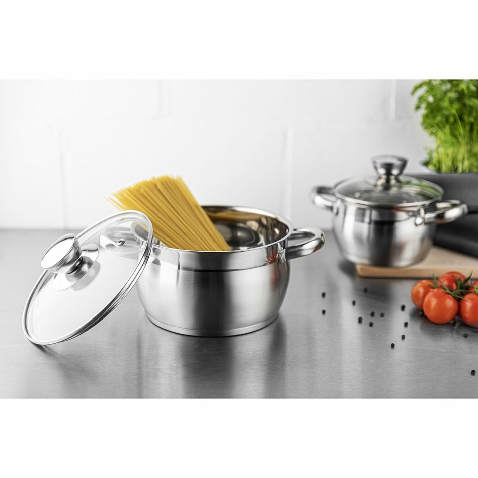 Táto súprava riadu OLIVER značky Florina je spoľahlivá pri každodennom varení.Hrnce sú vyrobené z najkvalitnejšej nehrdzavejúcej ocele 201. Trvanlivé a odolné voči korózii budú vyzerať veľmi pôsobivo aj po rokoch používania. Vo vnútri každého hrnca je ryska, ktoré uľahčuje meranie vody na polievku. Špeciálne profilovaný okraj uľahčuje nalievanie bez špliechania.Hrúbka steny: 0,4 mmDno: 3-vrstvovéRukoväte: nitované z nehrdz. ocelePokrievka: z tvrdeného skla s otvorom na odvod paryEnergetická úspora: hrniec sa rýchlo ohreje a dlho udrží vhodnú teplotuSúprava obsahuje: