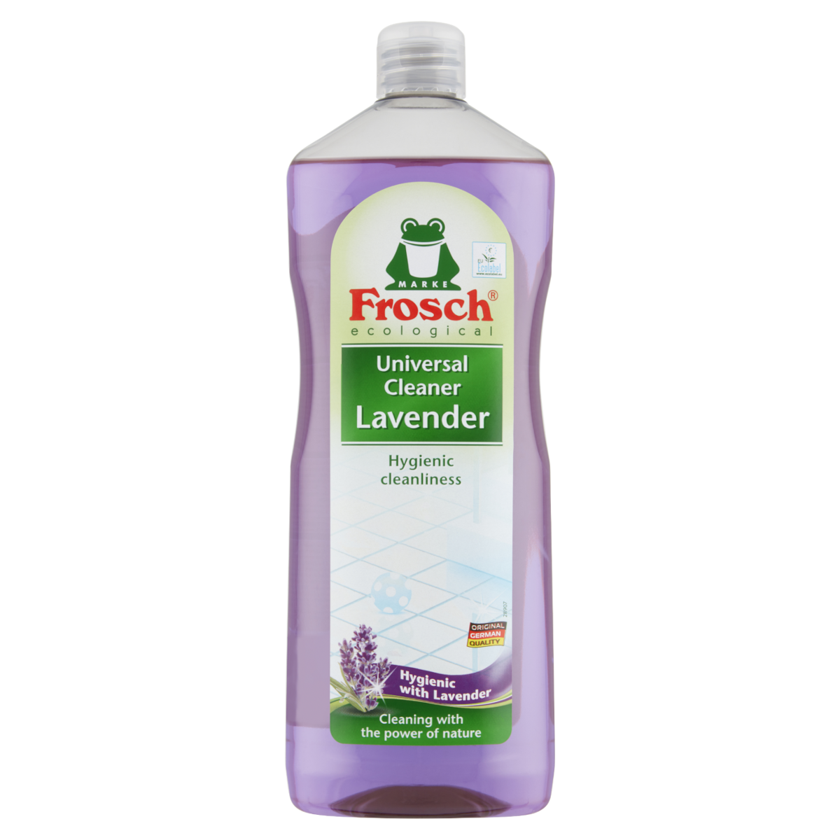 Všestranný levanduľový čistič je vhodný na podlahy a väčšinu umývateľných povrchov v domácnosti. Účinné zloženie s výťažkom z levandule zaisťuje hygienickú čistotu a príjemnú vôňu. Výrobok je ocenený certifikátom EU ECOLABEL.Frosch univerzálny levanduľový čistič je účinný v boji s odolnými nečistotami aj mastnotou. Zloženie obohatené o extrakt z francúzskej levandule účinne ničí baktérie, pohlcuje nepríjemné pachy a zanecháva jemne sladkastú a sviežu vôňu čistoty po každom použití. Veľmi dobrá znášanlivosť čističa s pokožkou bola potvrdená dermatologickými testami.Výrobok je po použití úplne biologicky rozložiteľný. Fľaša je vyrobená zo 100% recyklátu a po použití je znova recyklovateľná. Produkt je vegánsky a neobsahuje mikroplasty.