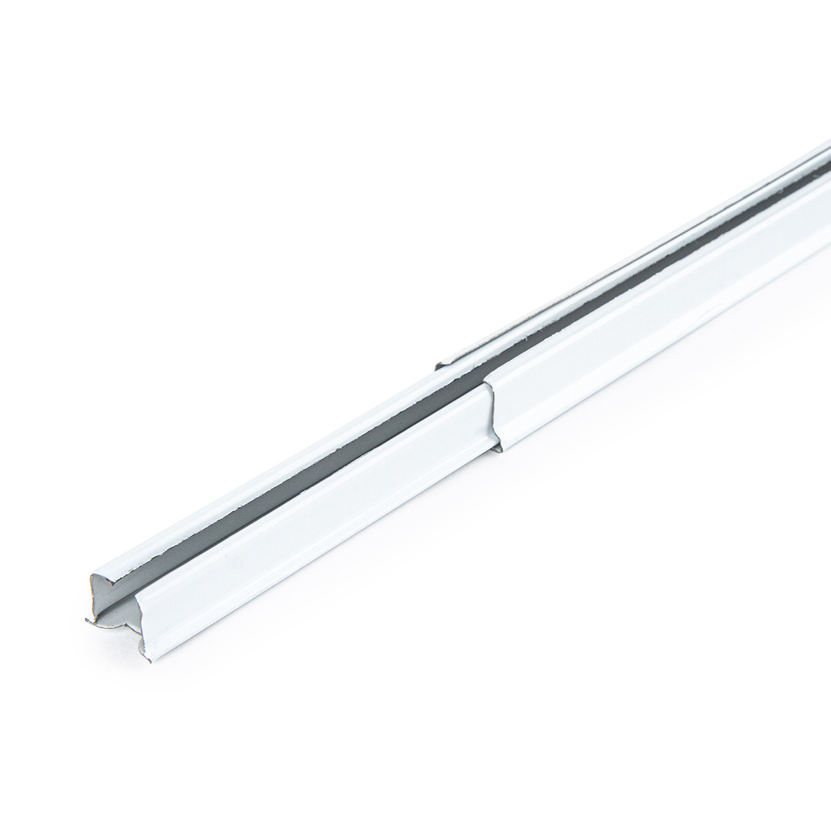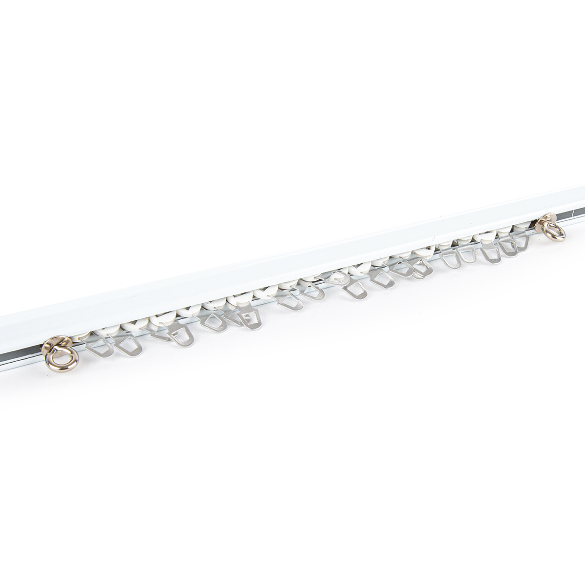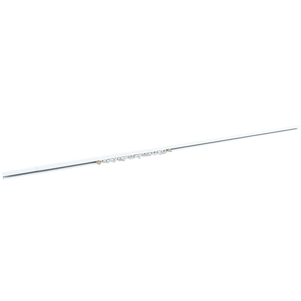 Kovová záclonová roztiahnuteľná koľajnička U-Ext, biela, 110 – 200 cm, komplet vrátane jazdcov a stropných nosníkov.
