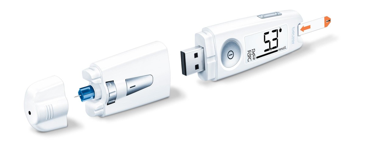 Pomocou prístroja môžete rýchlo a jednoducho určiť hladinu cukru v krvi, uložiť namerané hodnoty a zobraziť ich priemer pre optimálnu podporu kontroly diabetu (480 pamätí s dátumom a časom). Prístroj zaručuje v užívateľsky príjemnej úprave jednoduché a bezpečné meranie. Možno ho vďaka integrovanej prípojke USB pripojiť k počítaču. Na ňom potom môžete namerané hodnoty vyhodnotiť pomocou predinštalovaného GlucoMemory software (nemecky a anglicky) a vyhodnotenie využiť pre sledovanie hladiny cukru v krvi. AST umožňuje meranie na alternatívnych častiach tela. Súčasťou balenia je štartovacia sada: 3 v 1 monitor, AST uzáver, 5 ihiel, 5 testovacích prúžkov, batérie, puzdro, denník. Testovacie prúžky tiež zakúpite samostatne v našej ponuke.Modro podsvietený, dobre čitateľný LCD displej. Doba merania cca 5 sekúnd. Hmotnosť 37 g (s batériou). Batéria Lithium v balení. Rozmery: 12,3 x 2,8 x 1,6 cm. Materiál: zdravotne nezávadný plast. Vyrobené nemeckou spoločnosťou Beurer.Nemecká kvalita a predĺžená 5-ročná záruka.