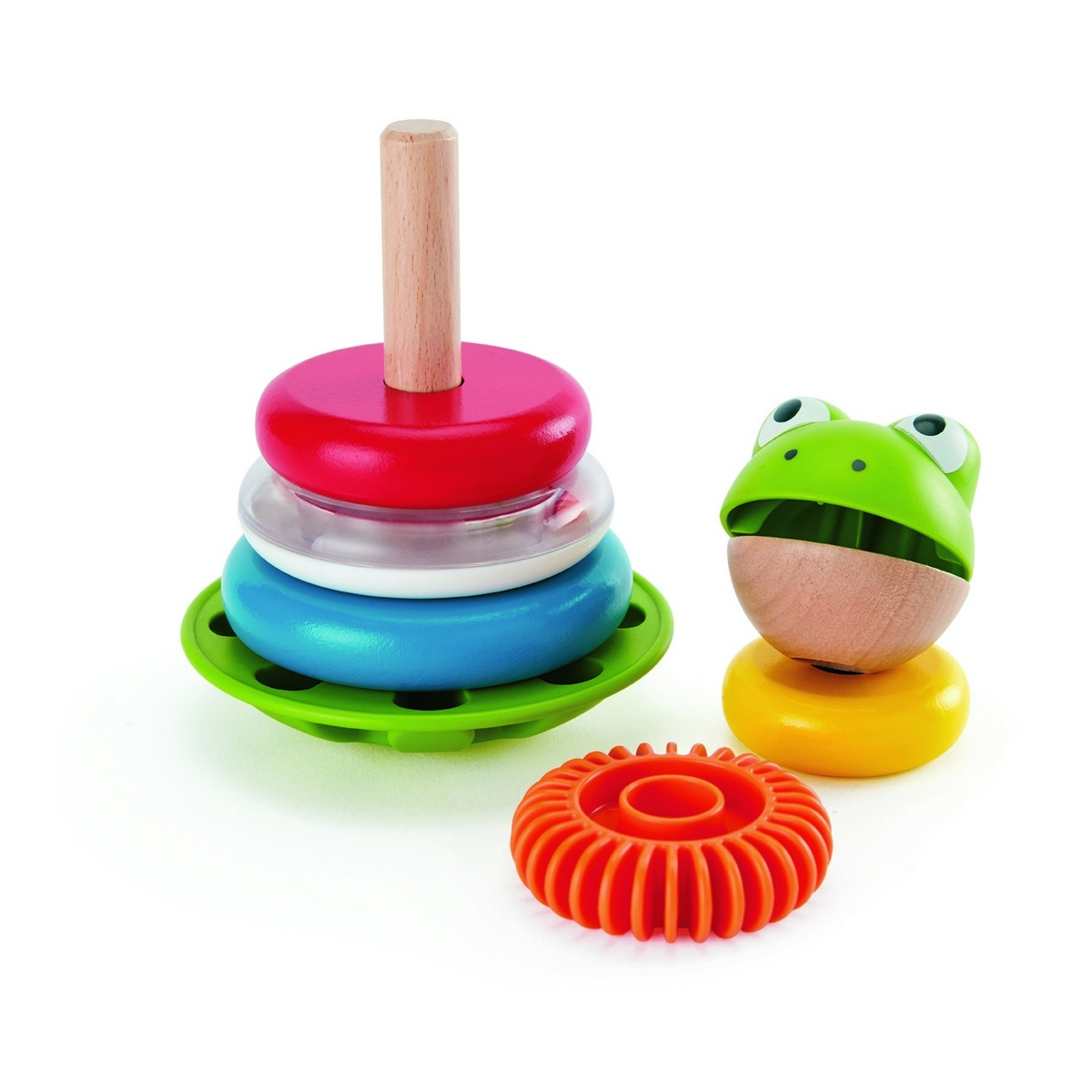 S pánom Žabiakom sa deti naučia nielen navliekať krúžky od najväčšieho po najmenší alebo naopak, ale aj počítať a spoznávať farby. Rozhojdajte pána Žabiaka po nasadení rôznych krúžkov a počúvajte, aké vydáva zvuky. Hračka podporuje motorický rozvoj a jemnú motoriku.