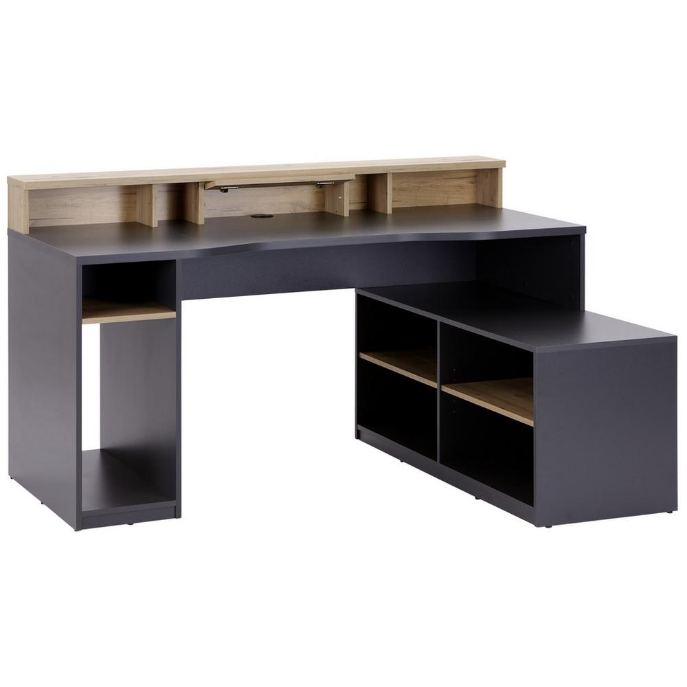 Tešte sa na ešte pohodlnejšie vybavenie, keď sa ponoríte do virtuálnych svetov! Tento hrací stôl vytvára dokonalé podmienky pre dlhšie hranie a zaujme štýlovým vzhľadom v antracitovom a umelom dubovom dekore.Vďaka praktickému uchyteniu monitora môžete hernú obrazovku umiestniť do optimálnej výšky. Káblový výstup vám umožní správne prepojiť vaše nastavenie. Osem otvorených priehradiek vám poskytne dostatok priestoru na uloženie hier a príslušenstva na dosah ruky. A v krabici vľavo dole je dostatok miesta pre váš počítač. Stôl má rozmery približne 160 x 91,5 x 120 cm (Š x V x H).Vytvorte dokonalý základ pre akčné herné stretnutia! Tento hrací stôl vám ponúka všetky výhody, aby ste sa mohli plne sústrediť na to podstatné.