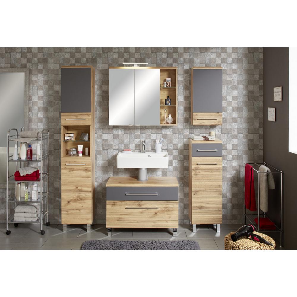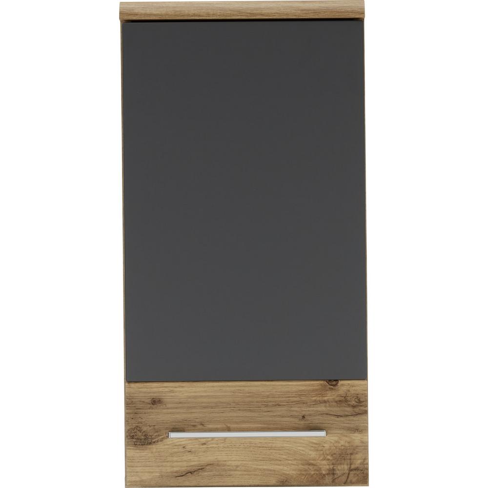 Horná skrinka s korpusom v dekore dub Wotan,dvere v kombinácii dub Wotan s vrúbkovaným povrchom/antracit. Skrinka má 1 dvere s jemným dovieraním a 1 vkladaciu policu.Š/V/H: cca 35/70/21 cm