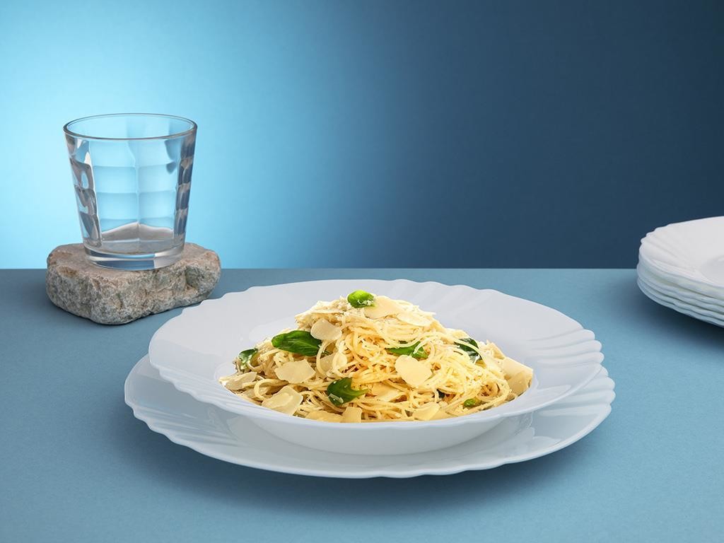 Jedálenská súprava Ebro + poháre 24 dielov je ideálna na každodenné stolovanie až 6 osôb. Je vhodná do umývačky aj mikrovlnnej rúry.Materiál: porcelán.Súprava obsahuje: – Hlboký tanier 6 ks – Plytký tanier 6 ks – Dezertný tanier 6 ks – Poháre na vodu Cube 6 ksJedálenská súprava Ebro + poháre24 dielovPre 6 osôbVhodná do umývačky a mikrovlnnej rúry