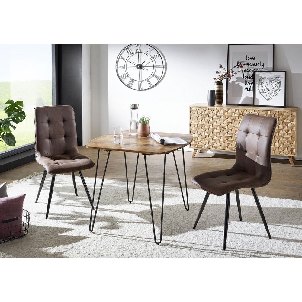 Tento tovar je k dispozícii iba ONLINE. Štvorcový jedálenský stôl KELA predstavuje moderný nábytok, ktorý vkusne kombinuje pravé drevo s puristickým priemyselným vzhľadom. Doska stola, s hrúbkou približne 15 mm, je vyrobená z masívneho palisandrového (sheeshamového) dreva a zaujme svojím prírodným zrnom v hnedých tónoch. Čierne kovové nohy v tvare písmena „U“ z lakovaného železa vytvárajú pôsobivý kontrast k teplému vzhľadu drevenej dosky. Vďaka svojim rozmerom, približne 80 x 76 x 80 cm (Š x V x H), predstavuje ideálne vybavenie do menších moderných bytov. Možno ho zaťažiť maximálne päťdesiatimi kilogramami. Upozornenie o doručení: Tovar bude doručený priamo od výrobcu špeditérskou firmou. Špeditér tovar vyloží na okraji cesty zadanej adresy, z tohto dôvodu je potrebné zabezpečiť svojpomocné odnesenie tovaru, a taktiež vlastný výnos do domu. Doručenie je uskutočnené prostredníctvom špedičnej firmy. O termíne doručenia Vás bude kontaktovať kuriér, s ktorým upresníte presný dátum doručenia. Upozornenie: Tento tovar sa nenachádza v našich predajniach. Objednať si ho môžete iba cez e-shop Möbelix.