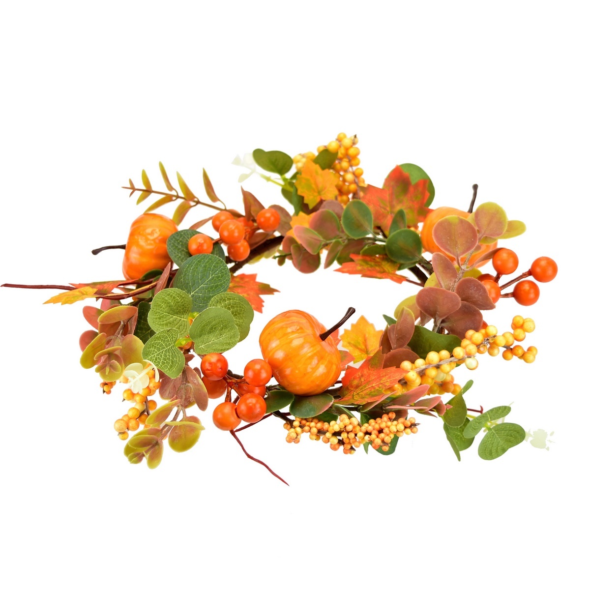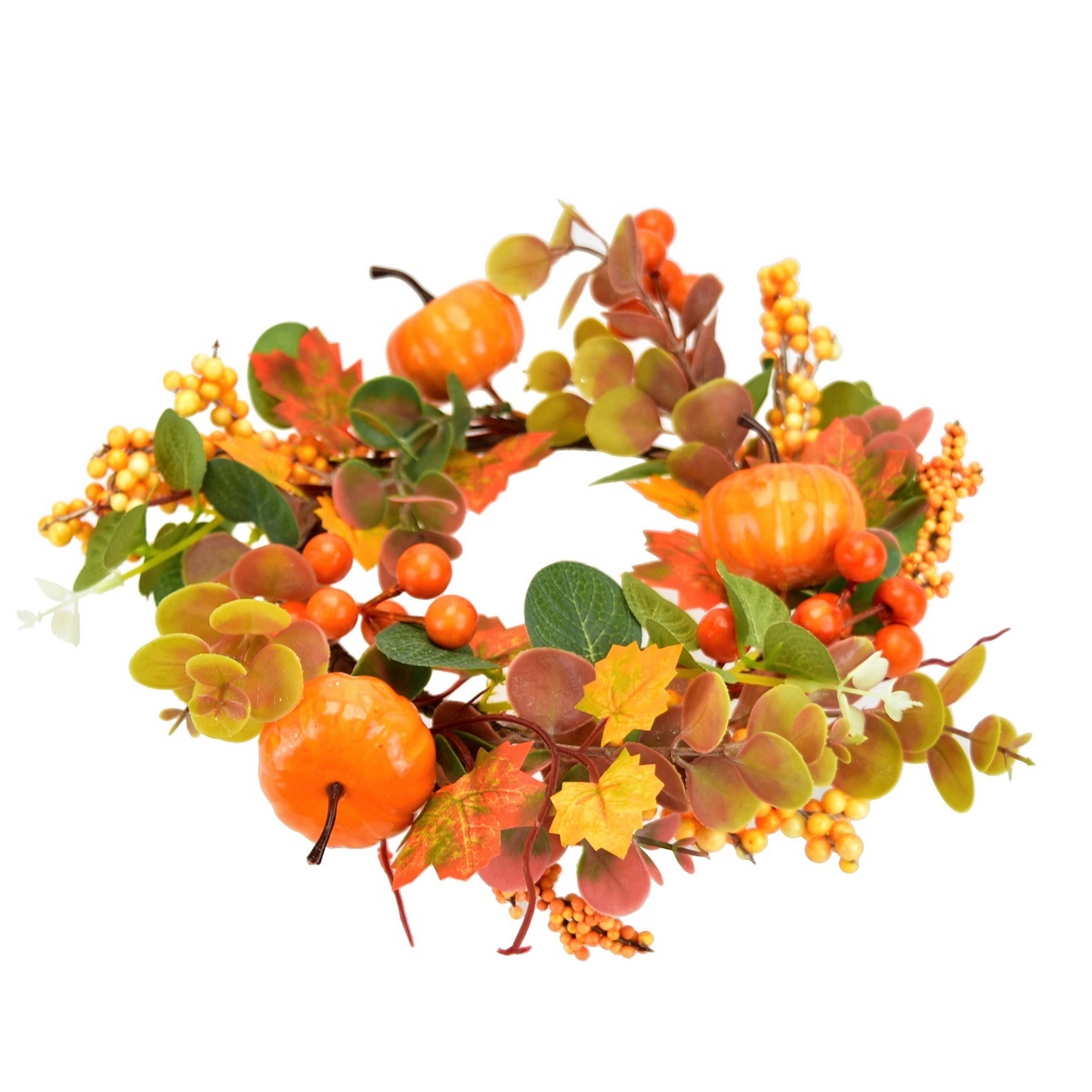 Pekne spracovaný jesenný venček s javorovými listami, tekvičkami a oranžovými bobuľkami doplní vašu jesennú výzdobu. Vhodný na zavesenie na dvere, do okna a na ďalšie dekorovanie.