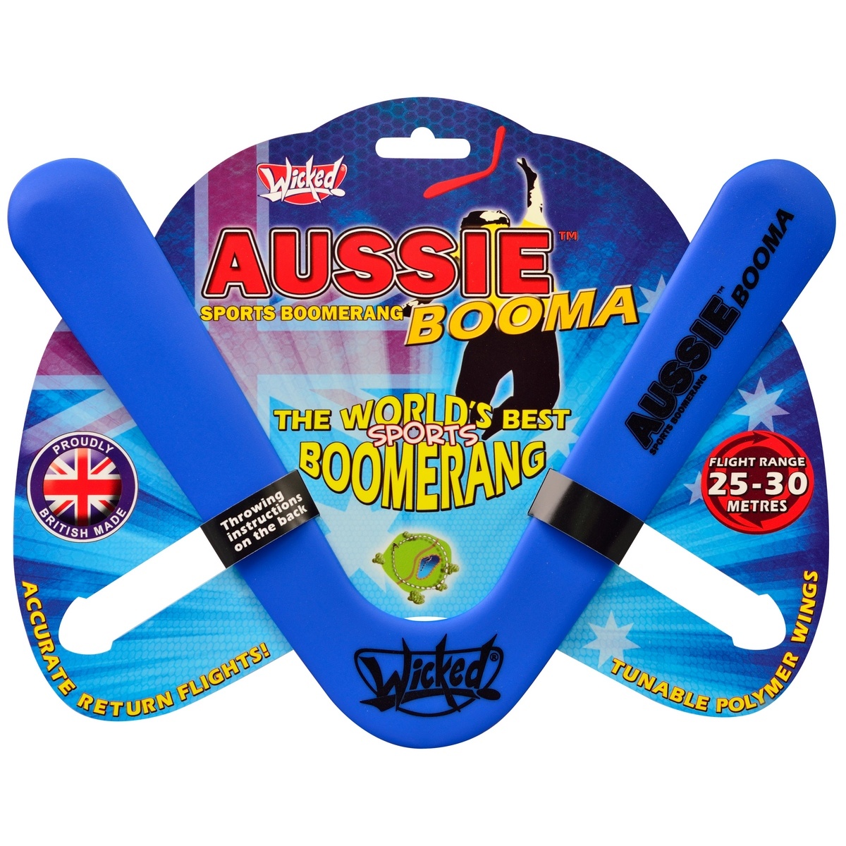 Wicked Aussie Boom – športový bumerang s dvojitou čepeľou určený pre strednú triedu. Tento klasický bumerang vychádza zo svetoznámej konštrukcie Wicked s tromi lopatkami, ale bol špeciálne navrhnutý tak, aby ponúkal rovnako hladký a presný spätný let v rozsahu od neuveriteľných 20 do 25 metrov.S bumerangom Wicked Aussie Boom získate nekonečné možnosti zábavy a športových dobrodružstiev. Ideálny pre všetkých milovníkov boomeringu a dobrodružstva, ktorí hľadajú spoľahlivý nástroj strednej triedy. Nenechajte si ujsť príležitosť stať sa majiteľom tohto výnimočného bumerangu!Dodávame vo viacerých farebných variantoch bez možosti výberu.