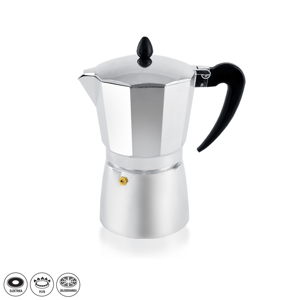 Tradičný kávovar pre rýchlu a lacnú prípravu mimoriadne chutného espressa vhodný pre použitie na plynových, elektrických a sklokeramických šporákoch. Jednoducho naplníte spodnú časť kávovaru teplou vodou a vložíte zásobník s kávou, naskrutkujete vrchnú časť kávovaru a môžete začať variť. Tlakom vznikajúcim pri varu sa espresso dostane do hornej nádobky a vy môžete nalievať. Materiál: zdravotne nezávadný hliník, držadlo – žiaruvzdorný plast, silikónové tesnenie – súčasťou balení 1x náhradné tesnenie. Kávovar má bezpečnostnú poistku.