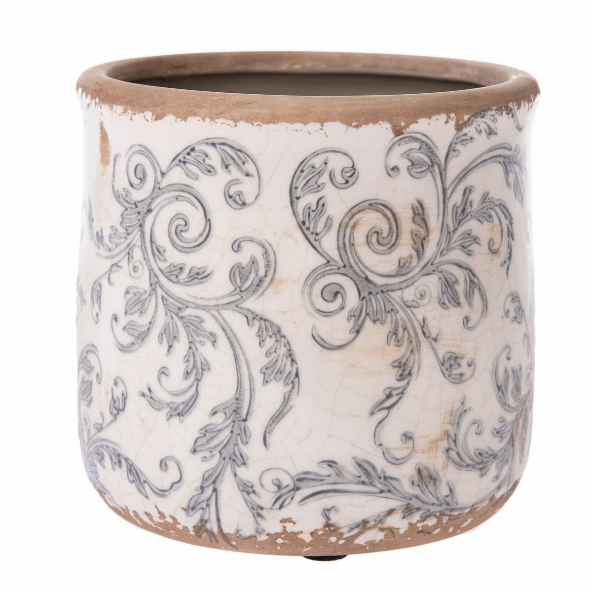 Keramický obal na kvety kombinujúci klasický dizajn s vintage estetikou je krásnym dekoračným predmetom s praktickým využitím. Charakteristiký dizajn vintage štýlu zastúpený popraskaným efektom spoločne s glazovaným povrchom s jemnými ornamentálnymi šľahúňmi lístkov vlniacich sa po celom povrchu vázy vytvára starožitný vzhľad prímorského charakteru. Klasický tvar kvetináča umožňuje jeho jednoduchú kombinovateľnosť a umiestnenie do interiéru na parapet, komodu či policu, kde zastane estetickú aj praktickú stránku.Vylaďte si interiér sadou Vintage Pompei a prepojte tak jednotlivé prvky vašej domácnosti do posledného detailu.