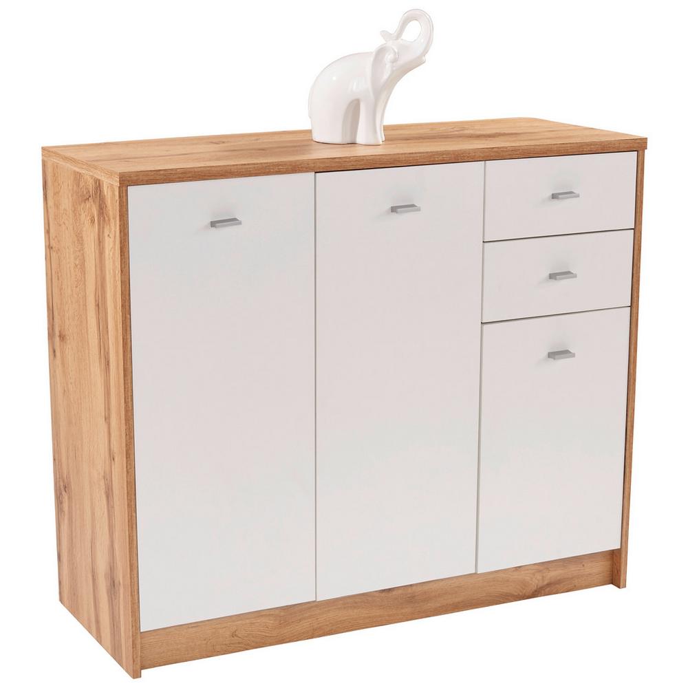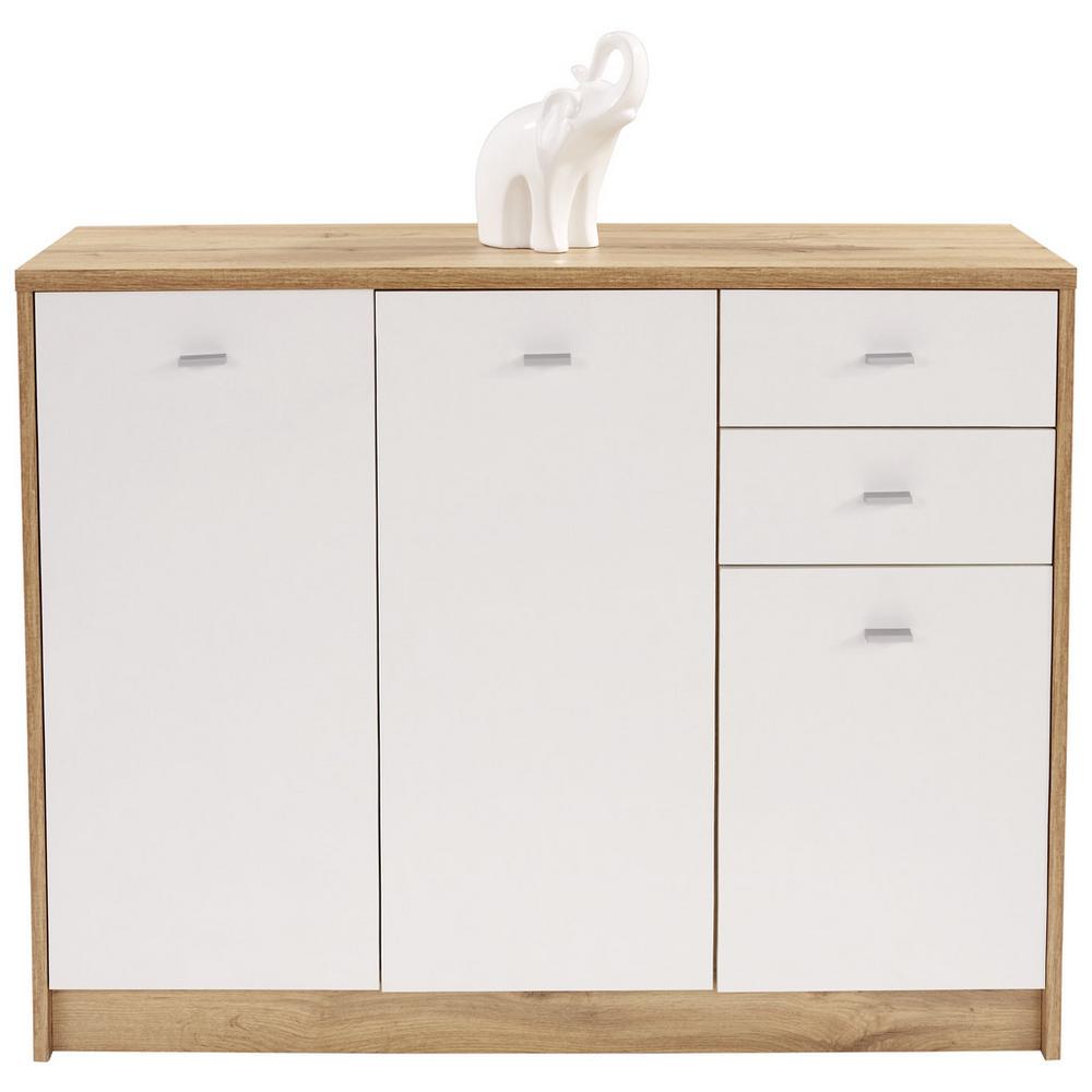 Komoda zo série 4-YOU NEW v dekore dub Wotan s čelom v bielej farbe je atraktívnym riešením ako ušetriť priestor a navyše harmonicky zapadá do takmer každého štýlu bývania. Komoda s rozmermi 109,1 x 85,4 x 34,6 cm (š/v/h) je vybavená 3 veľkými a 2 malými priečinkami za 2 dverami. Na odkladanie drobností sú vám k dispozícii 2 zásuvky. Vďaka tejto komode si urobíte doma poriadok bez akejkoľvek námahy. Möbelix-Onlineshop vám ponúka na výber aj ďalšie veľkosti a prevedenia komôd a regálov z tejto série. Kombinujte! Objavte v internetovom obchode Möbelix ďalšií nábytok z kategórií biele komody, komody dub a