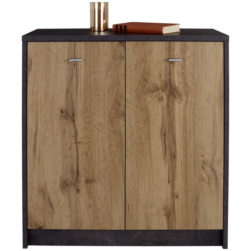 S touto elegantnou komodou zo série 4-YOU získavate do svojej domácnosti vizuálne príťažlivý, a zároveň praktický nábytok. Komoda vkusne kombinuje tmavý betónový dekor s dekorom dubu Wotan na čelnej stene. Nábytok s rozmermi cca 74 x 85,4 x 34,6 cm (Š x V x H) obsahuje 2 otočné dvierka, za ktorými sa nachádzajú 3 police. Dvierka sa otvárajú pomocou hliníkových úchytiek. Komoda je dokonalým riešením pre viac úložného priestoru v každej izbe aj vďaka ľahkej kombinovateľnosti s ďalším nábytkom z radu 4-YOU. Objavte v našom internetovom obchode ďalší nábytok z kategórií sivé komody, drevené komody a komody dub!