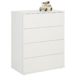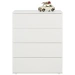 Pri tejto komode z dreveného dekoru v bielej farbe nás môže napadnúť niekoľko pojmov: minimalistická, krásna, moderná, … Komoda s rozmermi približne 75 x 95 x 43 cm (Š x V x H) dotvára váš interiér svojím lineárnym dizajnom a úložným priestorom. 4 zásuvky sa dajú otvárať bez úchytiek. Spríjemnite si interiér s týmto nadčasovým bielym nábytkom a dolaďte ho so zodpovedajúcimi dekoráciami. Komoda je dostupná v troch rozmeroch.