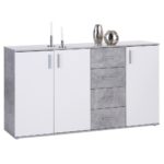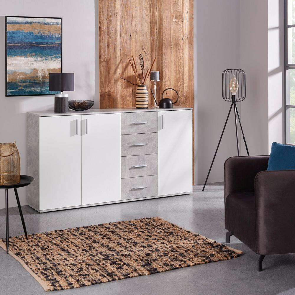 Uzavretý úložný nábytok zo série INA prináša prehľad a čistý dizajn do každej miestnosti. Komody INA sú k dispozícii v troch farebných prevedeniach a s rôznymi rozmermi. Komoda INA 04 je kompaktný kus nábytku, ktorý so svojím betónovým vzhľadom pôsobí veľmi príjemne, či už vo vstupnej časti príbytku, alebo v obývačke. S dekorom svetlý betón v kombinácii s bielymi dvierkami je moderným kúskom, ktorý si zamiluje každý. Za tromi otočnými dverami sú k dispozícii celkom dve police, ktoré delia vnútorný priestor na štyri priehradky. Police nie je možné výškovo prestavovať. Štyri zásuvky slúžia ako dodatočný úložný priestor na menšie predmety. Všetky zásuvky aj dvierka sa otvárajú pomocou plastových úchytiek vo vzhľade hliníka. Skrinka má celkové rozmery cca 175,8 x 94,8 x 38,3 cm (Š x V x H) a dodá vášmu domovu jednoduchý úložný priestor v krásnom vzhľade.