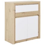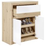 Táto atraktívna skrinka na topánky je súčasťou série KASHMIR NEW od spoločnosti JAMES WOOD, ktorá snúbi štýl s praktickosťou. Moderný botník, s rozmermi približne 84 x 98 x 41 cm (Š x V x H) vkusne kombinuje dekor dubu Artisan s matnou bielou farbou dvierok a zásuvky. Obsahuje 2 otočné dvierka, za ktorými sa nachádzajú 2 naklonené police na uloženie obuvi. Rukavice, šály alebo čiapky zase nájdu svoje miesto v priestrannej hornej zásuvke. Nechajte sa zlákať prírodným dizajnom radu KASHMIR NEW a vytvorte si v predsieni príjemnú atmosféru!