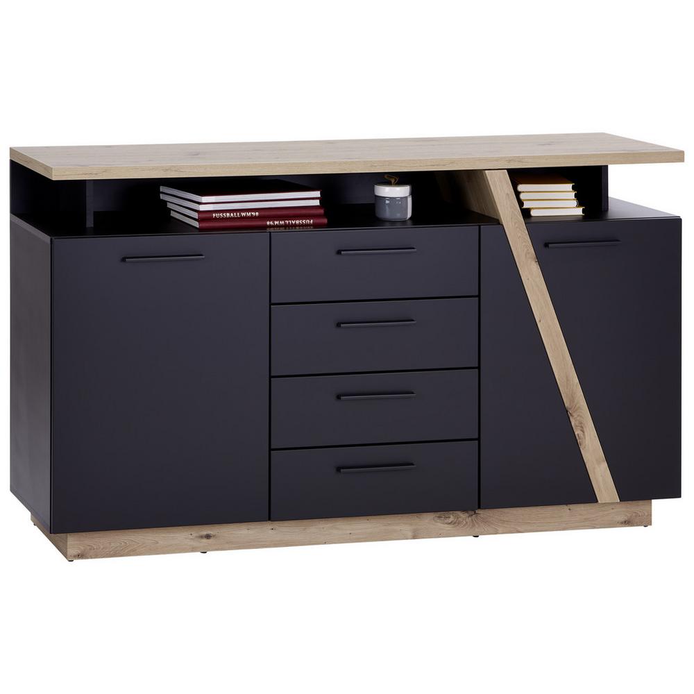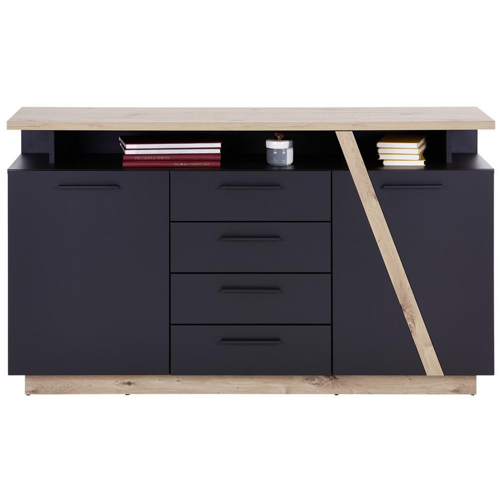 S komodou MAXI budú vaše veci nielen prehľadne uložené, ale ešte budete mať doma aj dizajnovo pútavý kúsok, ktorý bude ozdobou vašej domácnosti! Sofistikovaný vzhľad so šikmým trámom je šikovne podčiarknutý farebnou schémou s dekormi kozmická sivá a remeselný dub (dub artisan). Za dvomi otočnými dvierkami so štyrmi policami a štyrmi zásuvkami môžete uložiť všetko potrebné mimo dohľadu a prachu. Okrem toho delená, otvorená priehradka ponúka priestor na knihy alebo časopisy. Väčšie dekoratívne predmety, kvetiny alebo obrázky môžete umiestniť ako pútače na vrchnú plochu. Povrch bol upravený robustným náterom z melamínovej živice, je teda odolný voči poškriabaniu, ľahko sa čistí a udrží si dlhodobo pekný vzhľad. Rozmery nábytku sú približne 150,2 x 90 x 41,9 cm (Š x V x H). Zásuvky a dvierka majú systém tichého zatvárania. Dokonalá komoda s množstvom úložného priestoru a trendy dizajnom!