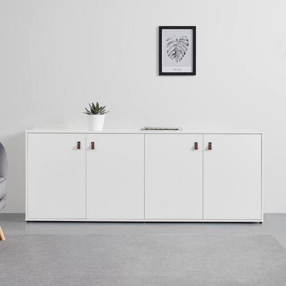 Tento výrobok je k dispozícii IBA ONLINE. Široká komoda MICK ponúka priamy vzhľad a praktický úložný priestor pre rôzne typy obytných priestorov. Biely príborník z MDF s hnedými úchytkami má za 4 otočnými dverami 4 pevné (nenastaviteľné) police. Optimálnu stabilitu zaisťujú guľaté gumené nožičky v čiernej farbe. Najdôležitej&