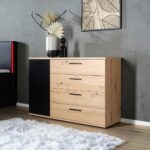 So sériou RACER-LIGHT zažiari spálňa alebo izba pre teenagerov trendy moderným vzhľadom. Od útulnej pružinovej postele, cez herný stôl až po šatníkovú skriňu, táto séria boduje kombináciou dubového dekoru s čiernymi akcentmi a rovnými tvarmi. Komoda s rozmermi cca 125 x 83 x 41 cm (Š x V x H) je ako stvorená na usporiadanie ponožiek a spodnej bielizne alebo na schovanie všetkého, čo by sa vám inak doma povaľovalo. Celkom ponúka komoda štyri zásuvky a jednu policu za otočnými dvierkami. Komoda je potiahnutá dekoratívnou fóliou a oživujú ju čierne úchytky. Komoda RACER-LIGHT je súčasťou rovnomennej série nábytku. Vyberajte a kombinujte jednotlivé prvky a vytvorte si tak doma príjemné prostredie v jednotnom dizajne! Pozrite si aj naše produkty z kategórie: čierne komody komody dub